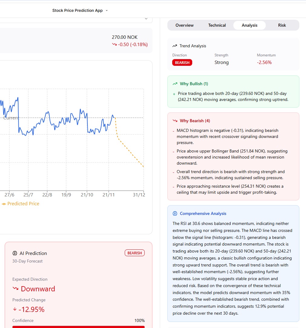 The RSI at 59.8 shows balanced momentum, indicating neither extreme buying nor selling pressure. The MACD line has crossed above the signal line (histogram: 0.13), generating a bullish signal that often precedes upward price movements. The stock is trading above both its 20-day (265.06 NOK) and 50-day (266.59 NOK) moving averages, a classic bullish configuration indicating strong upward trend support. The overall trend is neutral with weak momentum (+0.99%), indicating consolidation. Low volatility suggests stable price action and reduced risk. Based on the convergence of these technical indicators, the model predicts downward momentum with 59% confidence. The weak neutral trend, combined with mixed momentum indicators, suggests 1.5% potential price decline over the next 30 days.