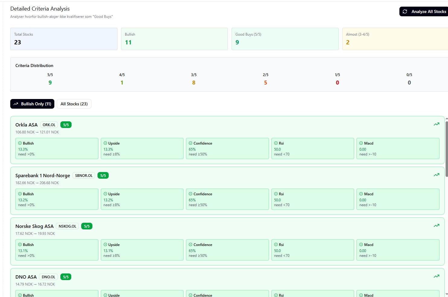 Vil også understreke at jeg for tiden har 0 aksjeposisjoner på Oslo børs og ingen personlige økonomiske motiver med appen i dag. Har dog erfaring som hobbyinvestor under Corona epedemien. Jeg lager appen fordi jeg har erfaring med IT og interesse for AI og økonomi.