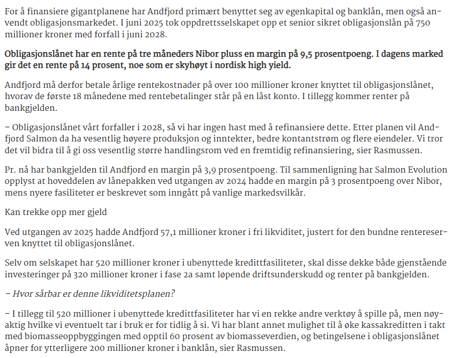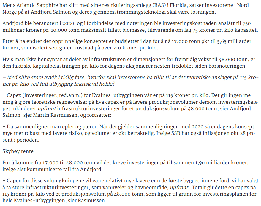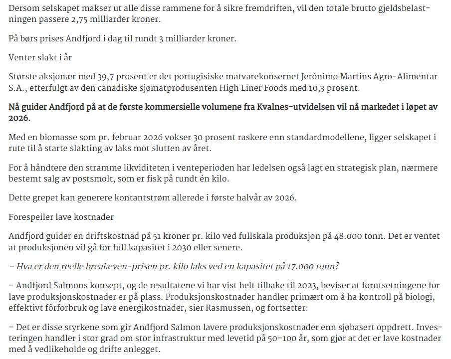 Biologien er fantastisk, og fisken vokser 30% foran Skrettings veksttabeller. For selskapets økonomi og logistikk er dette musikk i mine ører. De beveger seg inn i et helt annet territorium enn andre oppdrettsselskaper. Fullt utbygget med 12 mndr vekstsyklus og produksjon av storsmolt med høy kvalitet, vil marginene bli høyere enn noen andre vil klare. De vil sannsynligvis ligge på Bakkafrost-nivå i sine glansdager når vi skriver 2030. Men det vil ta noen år, for det skal bygges maaange basseng. Vi vil få flere gode svar allerede i år og i 2027. Rettsaken blir en parentes i den store sammenhengen.