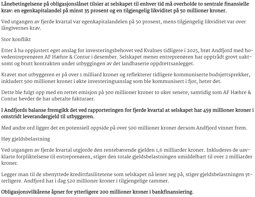 Med en så dominerende industriell ankeraksjonær, kombinert med High Liner Foods (10,3%) og Eidsfjord Sjøfarm (3,3%) — alle med strategiske interesser i Andfjords suksess — er sannsynligheten for et fiendtlig eller opportunistisk oppkjøp minimal, mener jeg.