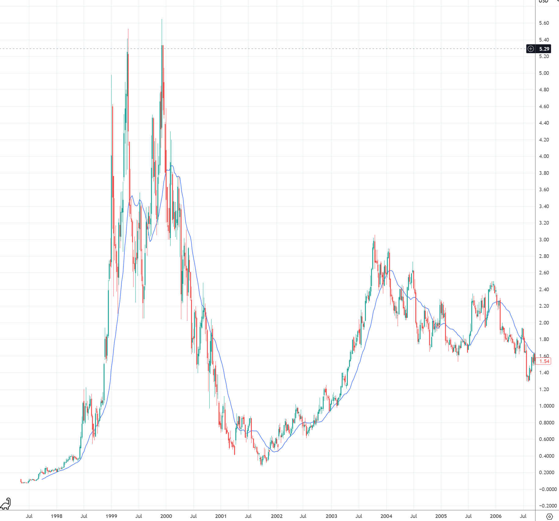Til slutt spilte det ingen rolle om du kjøpte på 5 eller 0,3, du ble samme hva rik, men det ville nok vært “litt” vanskelig å holde på aksjen gjennom det fallet der.
