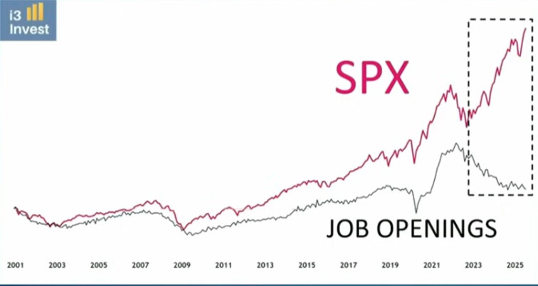 Ja, og når man finner slike “korrelasjoner” mellom de amerikanske indeksene og et eller annet i den amerikanske økonomien så kan man også ha i bakhodet at dette er i stor grad globale selskaper, med 40 % av omsetningen, eller noe sånt, fra andre markeder. Disse jobbtallene i den grafen siger ned mot et mer normalt nivå etter post-korona overopphetingen.