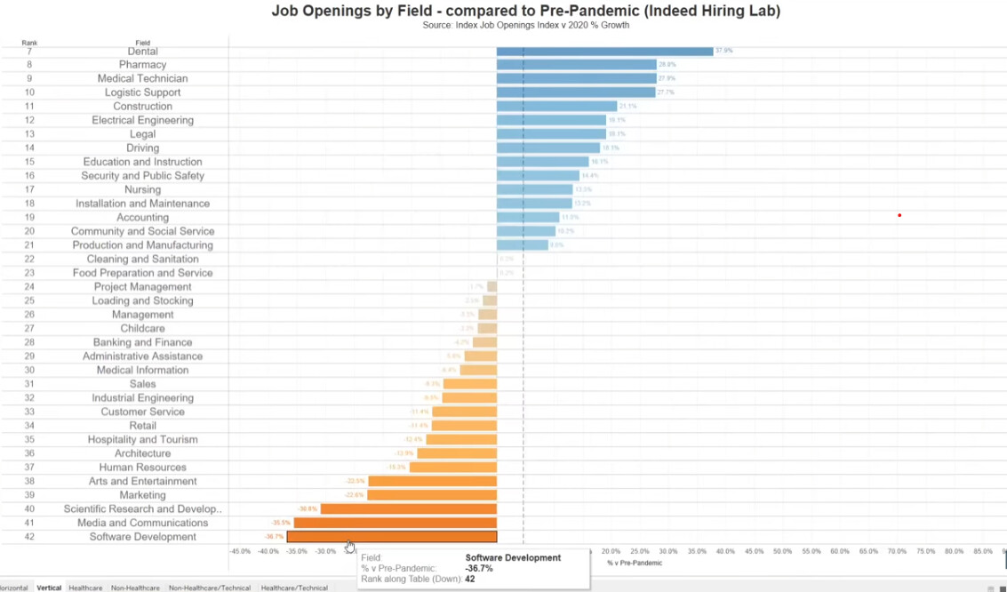 Det du kaller “IT-folk” her er software-utviklere i oversikten din, som altså sammenlikner ledige stillinger med nivået før covid. I mellomtiden har denne yrkesgruppen hatt en periode med voldsom ansettelsestempo under nullrentebonanzaen,som ingen andre yrkesgrupper kan matche og som nå har roet seg betraktelig.