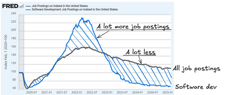 Det koker ned til om man tror ledige stillinger er en indikator på lavere “AI-investeringer” i årene som kommer. En “AI-investering” er så mangt. Når man ser på big techs planer i årene framover så er det mye som tyder på at det blir et visst trøkk i årene framover også. Hvem som høster frukter av dette og hvem som taper på det gjenstår å se.