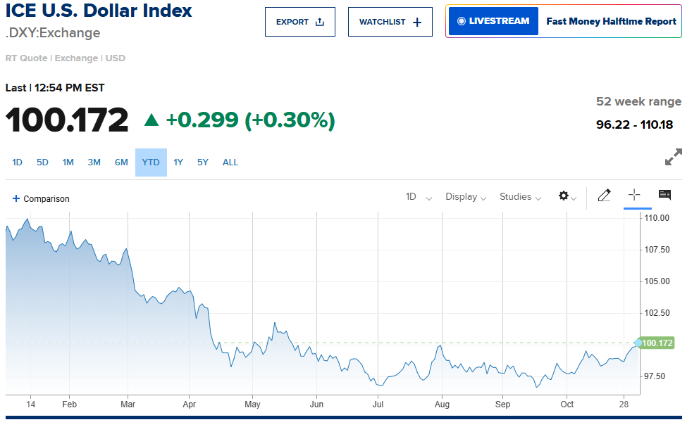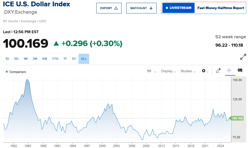 Og historisk sett er ikke 100 så svakt, og går den feks til 102-103 så er det bare få signifikante perioder DXY har vært sterkere; i noen år etter 1982 og noen år etter 2000.