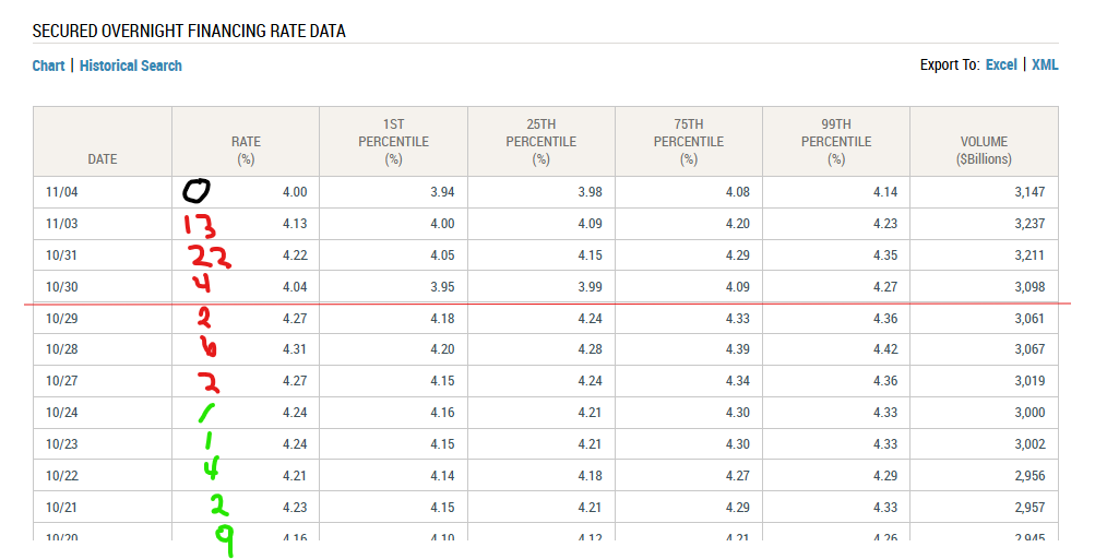 men er fortsatt på grensen; 4,00 som er høyt i historiske sammenhenger, om man sammenligner med “discount window”, dvs FEDs renteinervall, ref figuren jeg postet for noen dager siden der SOFR var 22 basispunkter over:
