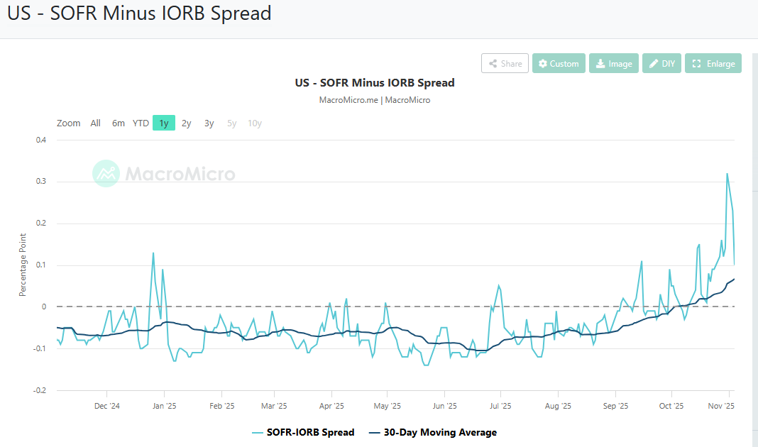 Men tilbake til SOFR som har roet seg ned, for det er ikke så enkelt at det bare SOFR er innen for rentevinduet så er alt greit, også avstanden til IORB er viktig, og ikke minst trenden (moving average) i den:
