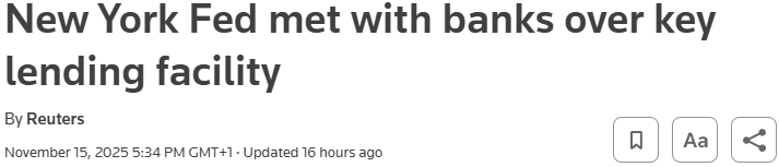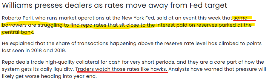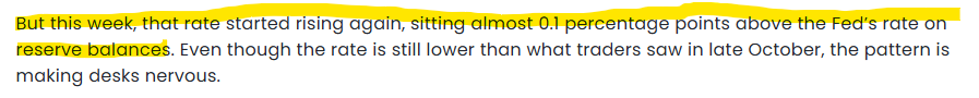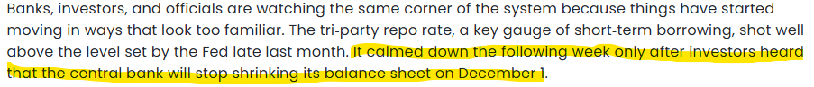 Som artikkelen referer, så var det dette FED prøvde å adressere ved forrige rente-møte å signalisere end of QT, samtidig mindre sjanse for rentekutt 1. desmeber: