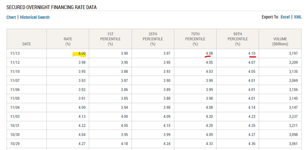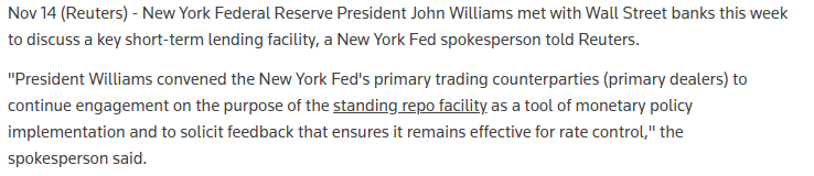 Blir faktisk litt spennende å hva SOFR kommer inn på for fredag 14.11, for tallene kommer først på mandag 08:00 ET (Eastern time), og om 1) markedet sniffet ut dette “sudden and clsoed door”-møtet, og 2) om det drar SOFR oppover.