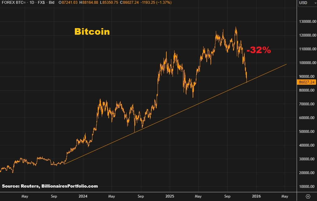 As we discussed earlier this week, the Bitcoin chart has been one to watch. It’s down 32% from the October 5th record highs (just six weeks ago), and it’s just had nine consecutive trading days with lower lows – and we end the day testing this big trendline.