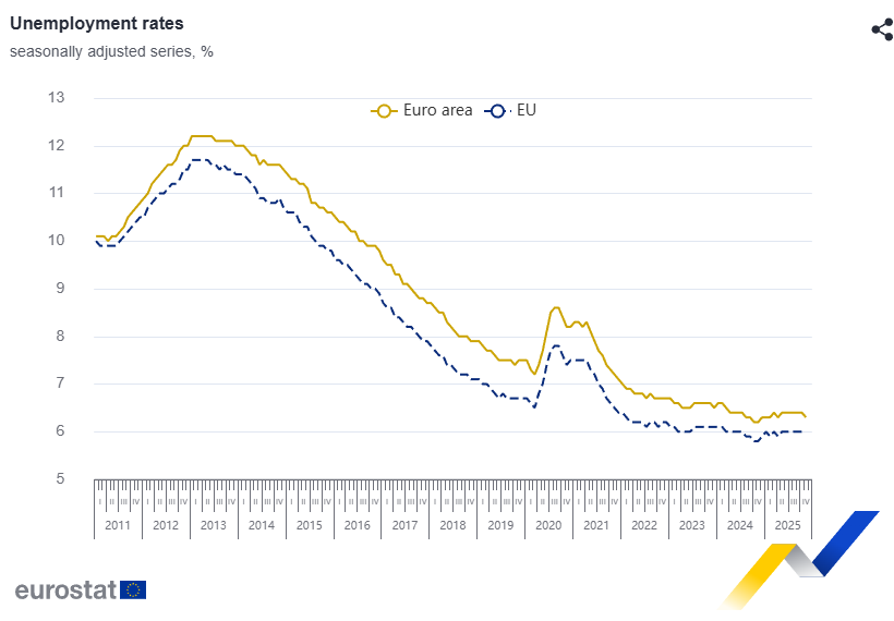 In November 2025, the euro area seasonally adjusted unemployment rate was 6.3%, down from 6.4% in October 2025 and up from 6.2% in November 2024. The EU unemployment rate was 6.0% in November 2025, stable compared with October 2025 and up from 5.8% in November 2024. These figures are published by Eurostat, the statistical office of the European Union .