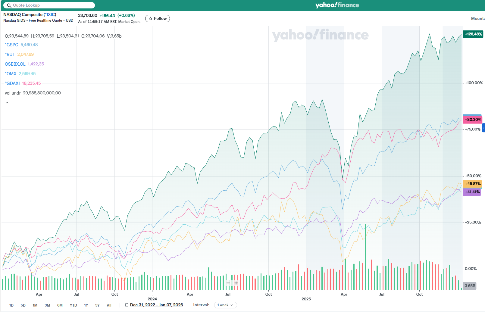 Siden denne bearfestens start 01.01.2023 er Nasdaq den store vinneren, med en oppgang på over 100 %. F.eksTyskland har gjort det ca like bra som SP500. Kanskje et uttrykk for at Big tech stikker av med profitten, og fremtidstroen. R2K, som til en viss grad er “small tech”, gjør det markant dårligere enn f.eks. SP500. Euro har styrket seg med ca. 15 % i samme tidsrommet, NOK nokså flat, mens SEK har styrket seg litt over 10 % . I et 5-års perspektiv er det mye jevnere i toppen, men fremdeles R2K er taperen