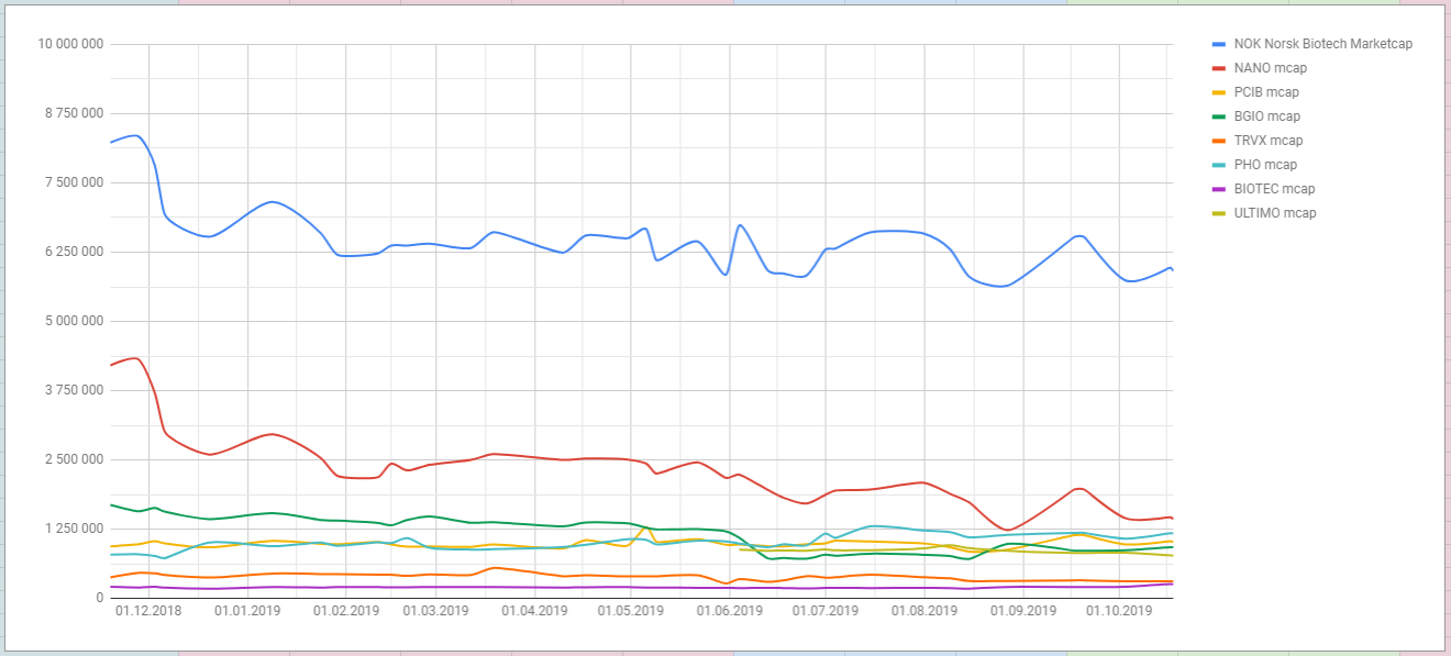 PHO rød, NANO lilla, BGBIO grønn, PCIB blå, TRVX orange, ULTIMO brun