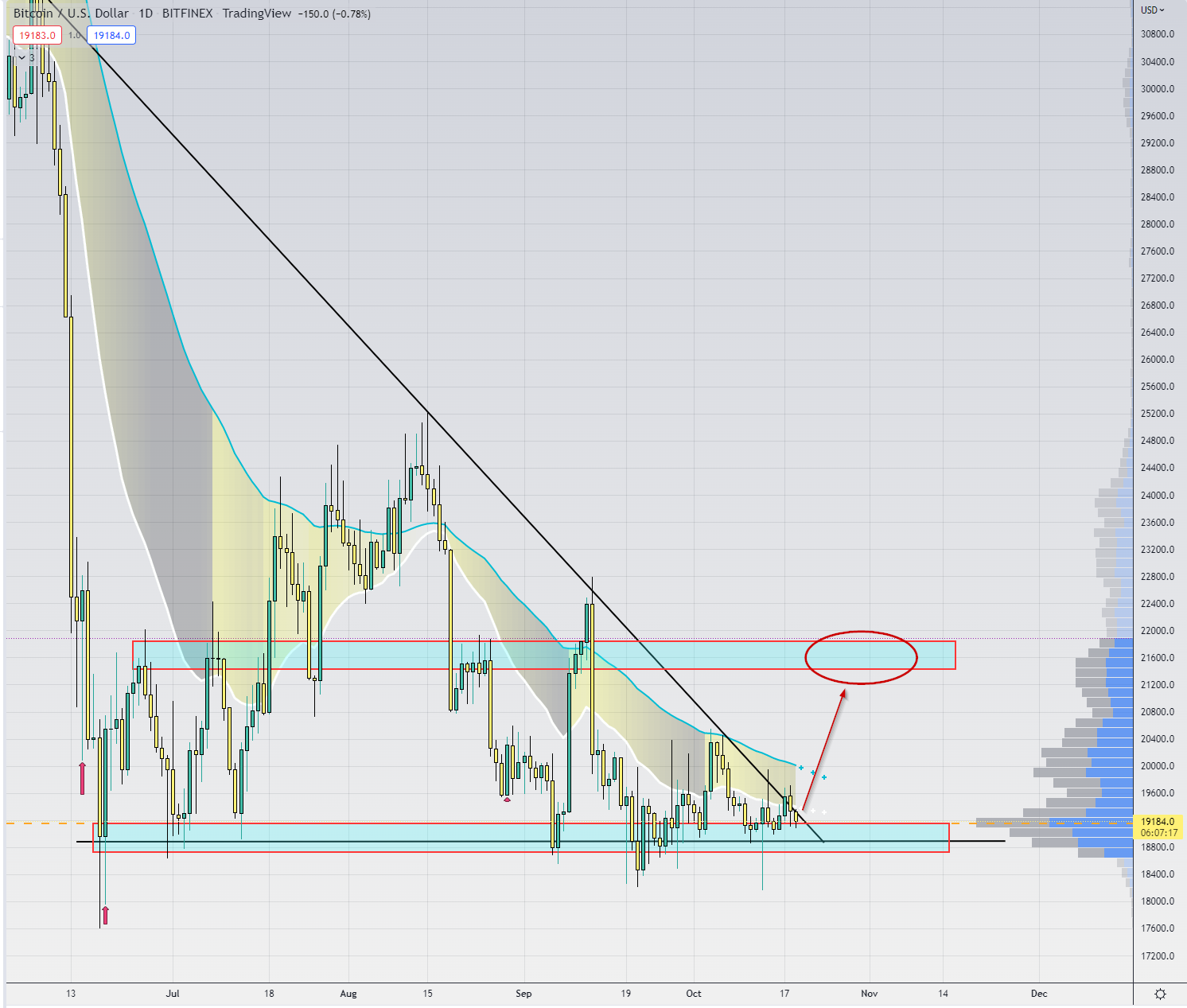 Lengre sidelengs bevegelser har en tendens til å bryte trender, og adopsjonen av btc på verdensbasis er fremdeles høy, så jeg mener dess lengre akkumulasjon på disse nivåene, dess større sjans for bunn er satt (17.600). Den lange trenden er opp, og volumet akkumulert rundt 20.000 er også høy. Ser bra ut