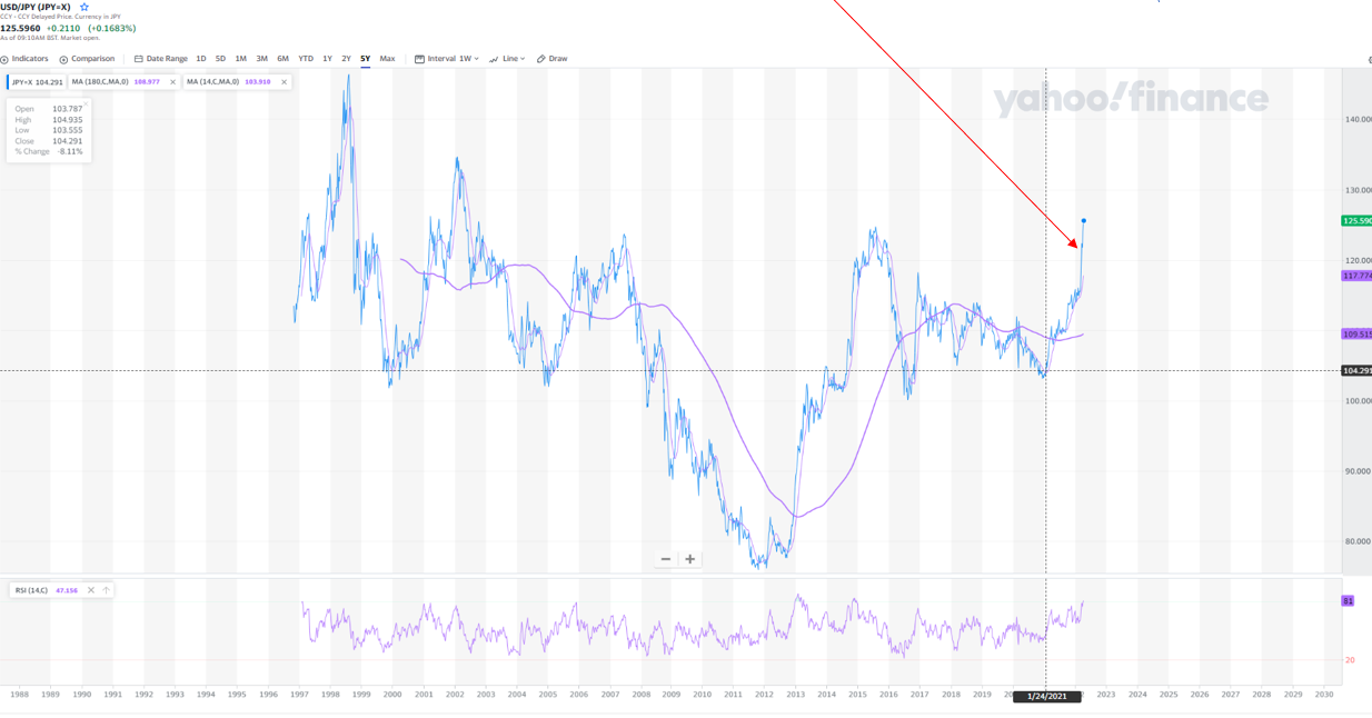 Som jeg skrev i et lengre innlegg tidligere så har Japan sagt at de skal kjøpe obligasjoner for å holde yielden nede, og er villig til å la USDJPN skyte i været og importere inflasjon, og pga kontinuerlig press på yield verden over så presses de ganske hardt nå!