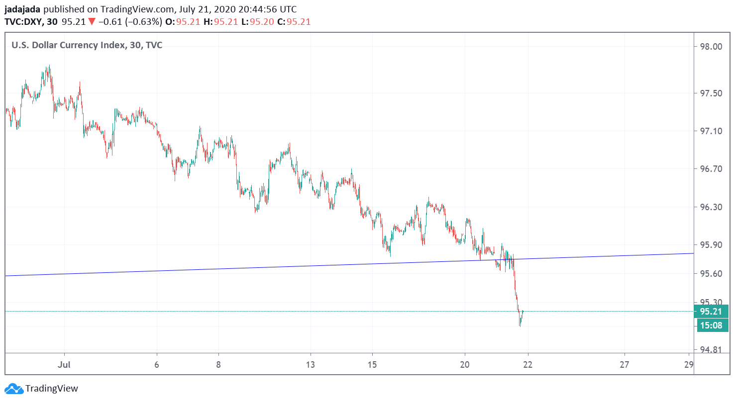 Noen som følger med på DXY?? Dollarfallet tiltar, kan være starten på det kommende crashet. Ting skjer raskere i dag, mange sitter klar på salgsknappen, kan bli stygt…