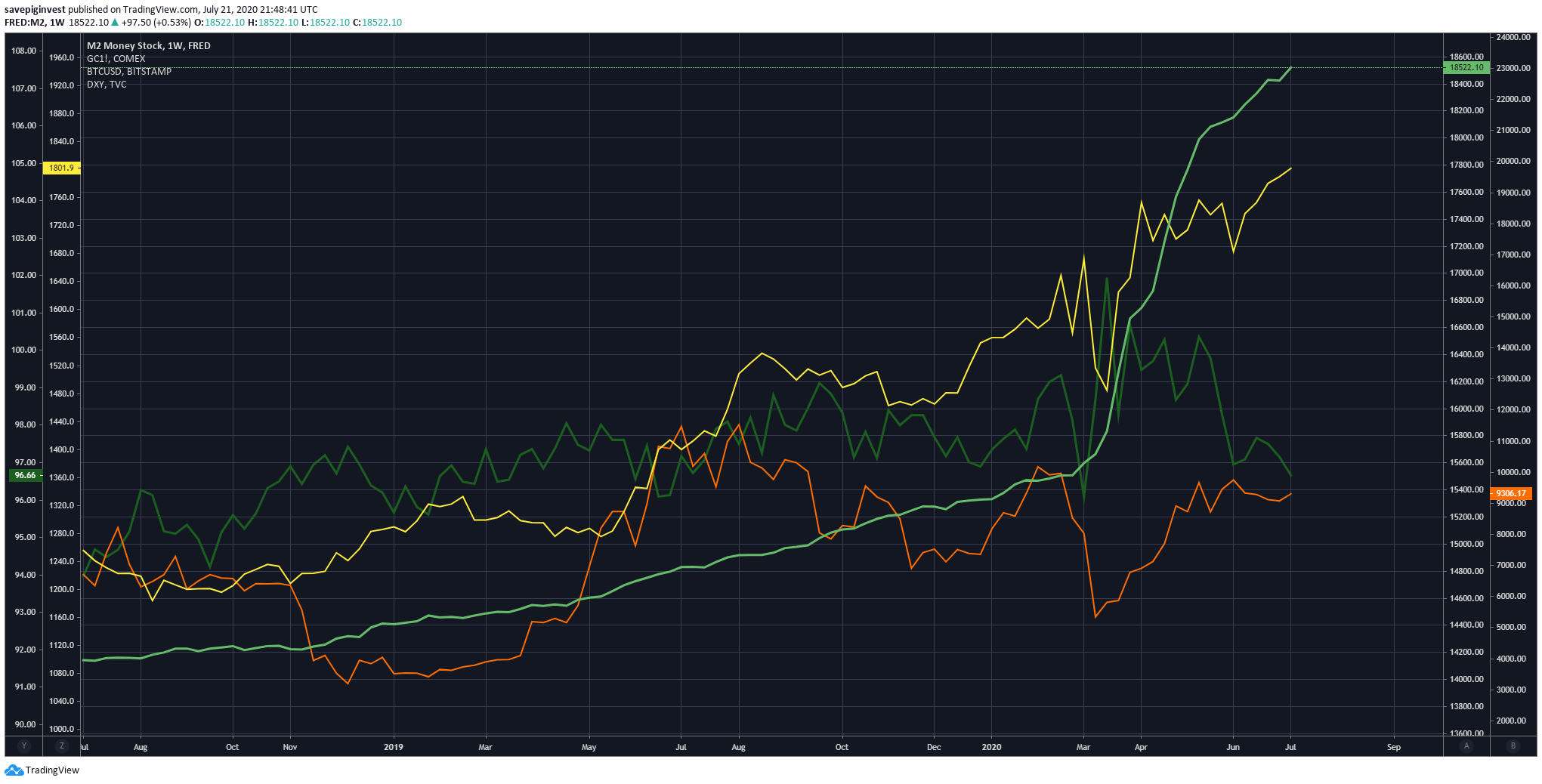 Ja jeg ser på den, har også laget meg dette chartet som sammenligner money supply, dxy, gull og bitcoin.
