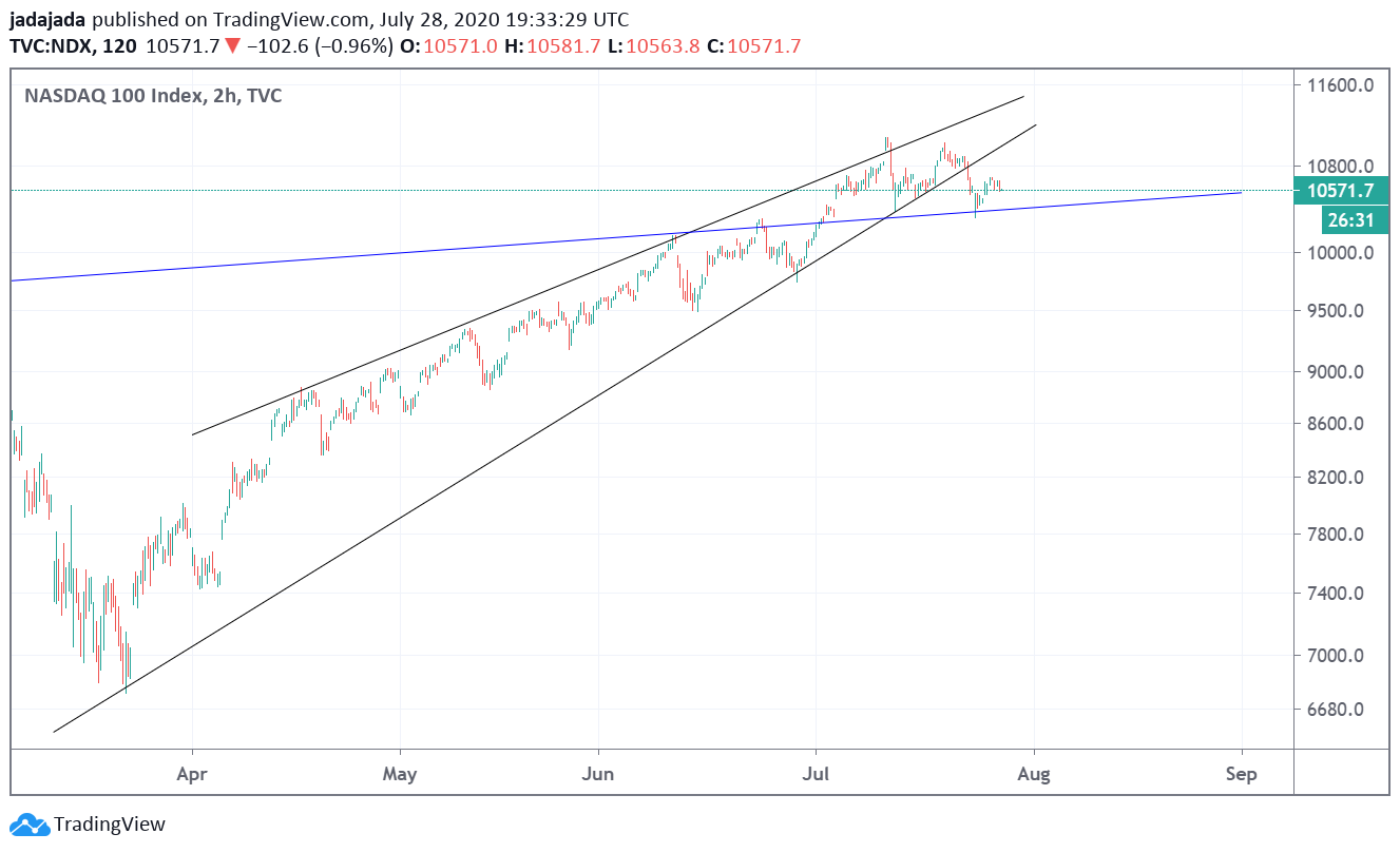 NDX har i stor grad ledet an ledet an det vanvittige rallyet vi har sett på børsene. Nå kan det være slutt Forventer at vi får brudd tilbake under den stigende lange trenden i første omgang (blå linja)