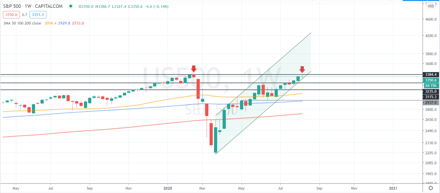 Det skumle med S&P er jo at et etablert brudd over ATH vil signalisere videre oppgang. Taket på trendkanalen kan gå helt opp mot og over 4000 - det gir INGEN mening @Christian, men man må holde ALLE muligheter åpne