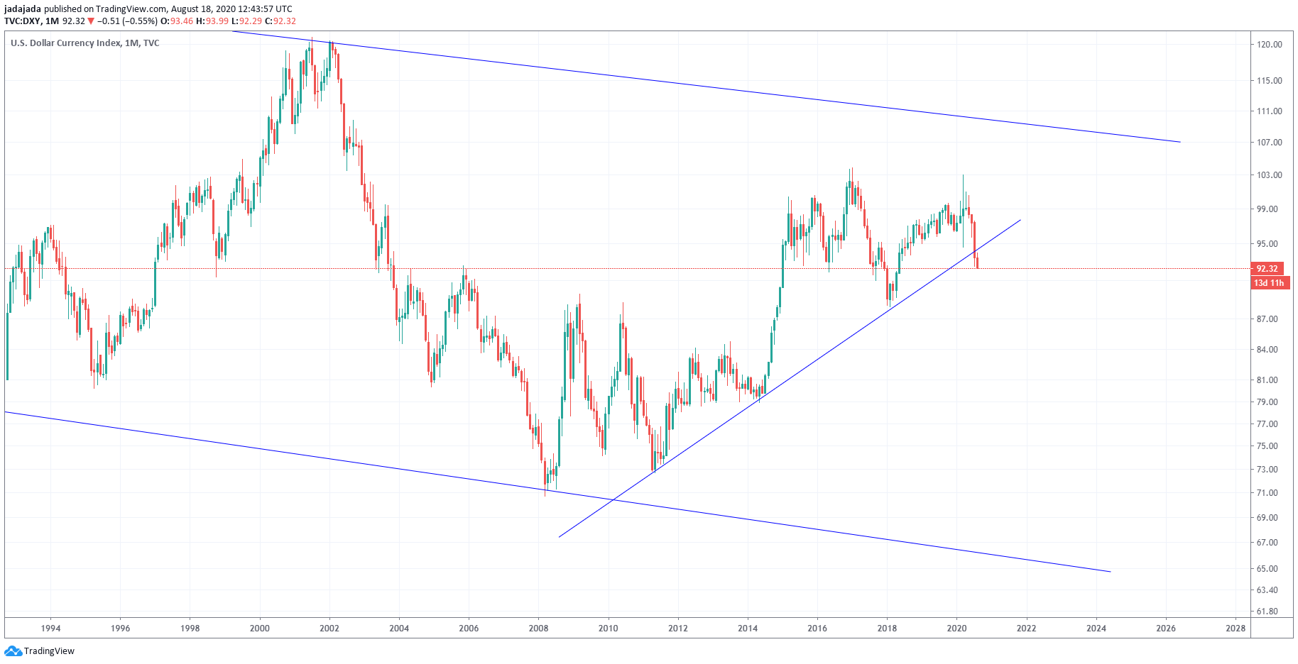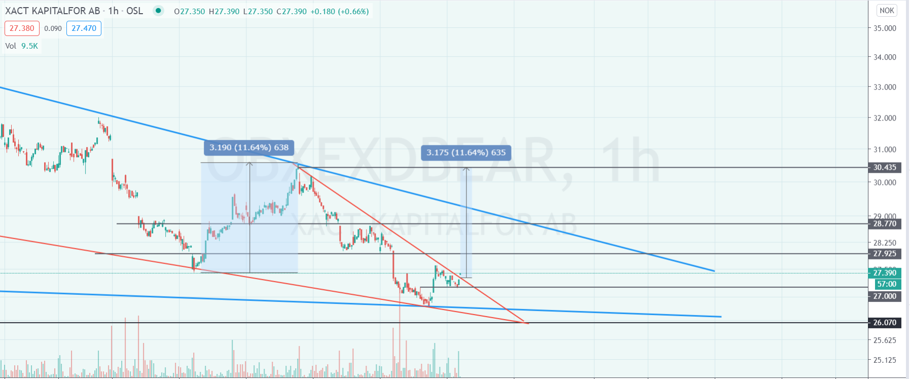 Ja, enormt thight nå. Vanskelig å si noe uten volumprofil, men hele greia lukter jo bottrading ut fra candles. I et normalt marked hadde denne formasjonen brutt ned for lenge siden, og det kraftig. Nå begynner weekly å bli extended, så jeg tenker det ikke kan fortsette med +0.5% ut uken. Spørsmålet er om korreksjonen blir langvarig eller kort