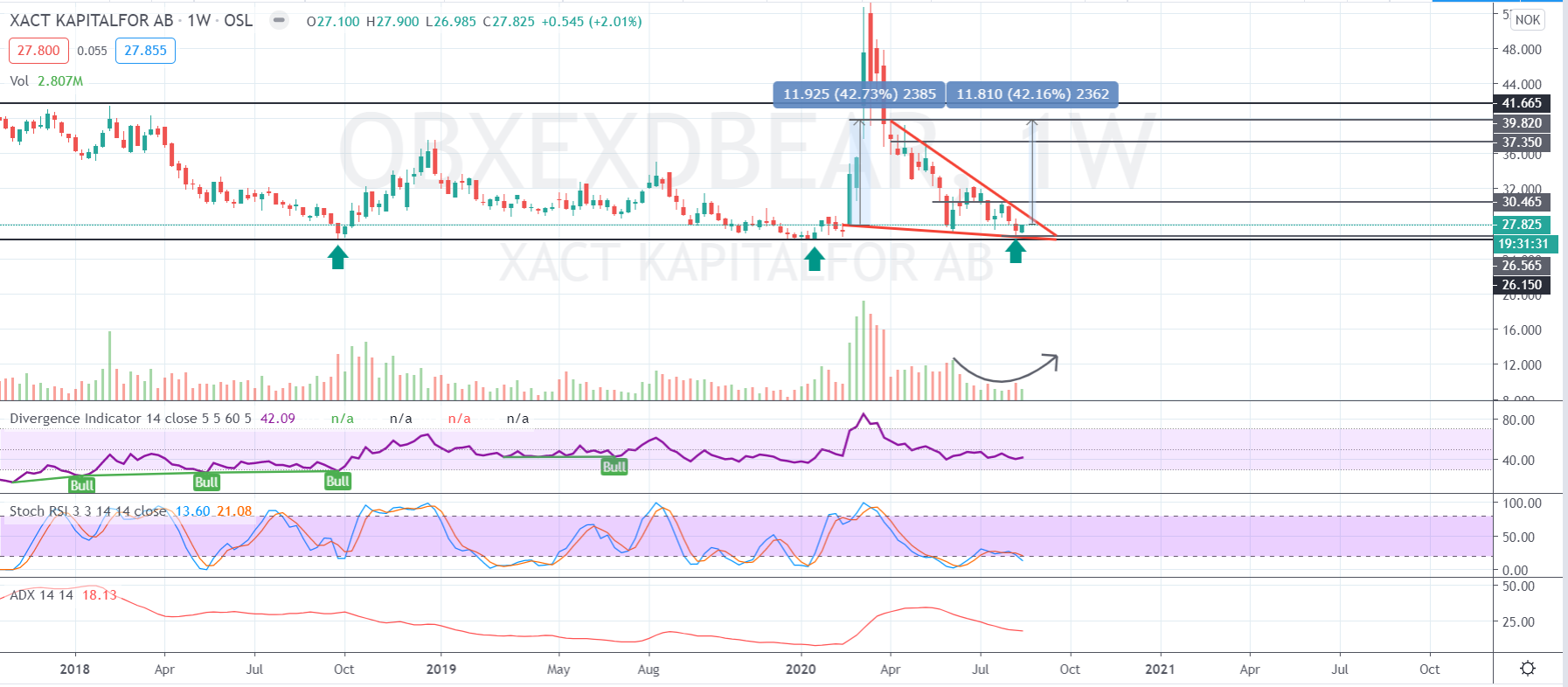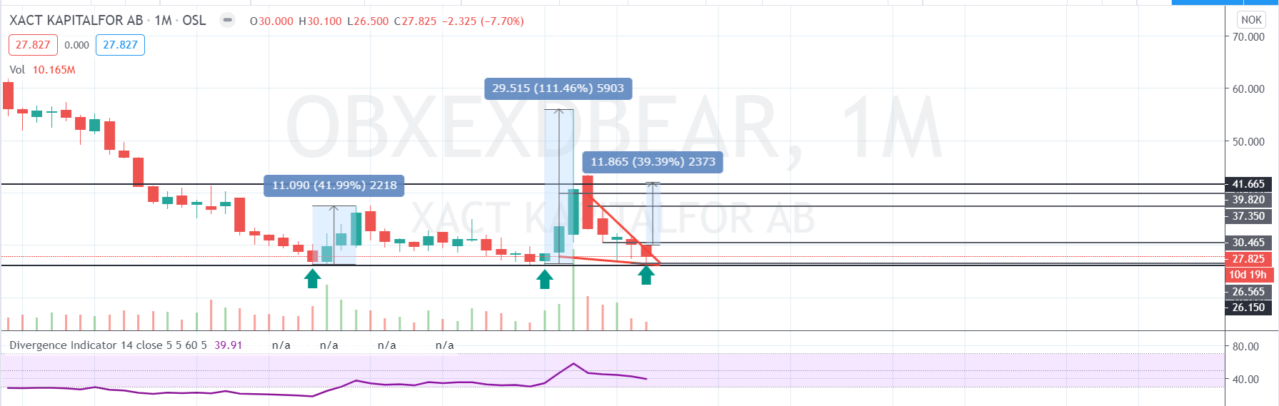 Det er litt make or break for OBX bear - den har “alltid” tatt i mot her nede og rekylene har vært brutale (har bare sjekket 2 år tilbake i tid). Om historien gjentar seg kan man gjøre gode penger ved brudd opp her. I motsatt fall så blir det ATL og kanskje litt dommedag. Jeg kommer i allefall til å holde posisjonen til neste uke, og helst litt inn i september, det tror jeg blir en god bjørnemåned