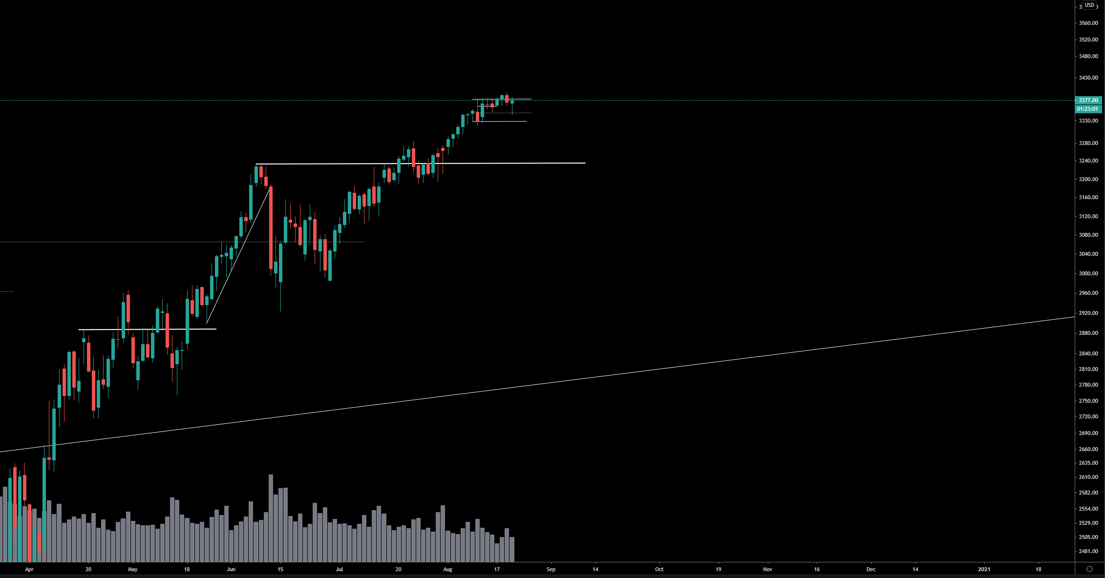 For det andre, la oss si vi får en test til nedsiden / toppen av rangen (3220ish?) - det vil bety brudd på formasjonen jeg har tracket over flere uker nå - ascending wedge, som såklart er bearish