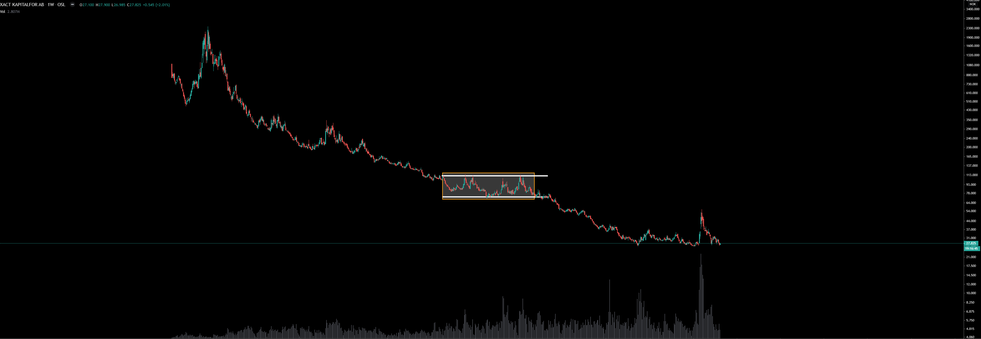 Sist gang den var her nede var 02.01.20 – gangen før det var 03.09.18. Den har aldri vært lavere enn 26 kr, og dette er 3. gangen vi er her nede. Det er signifikant i mine øyne.