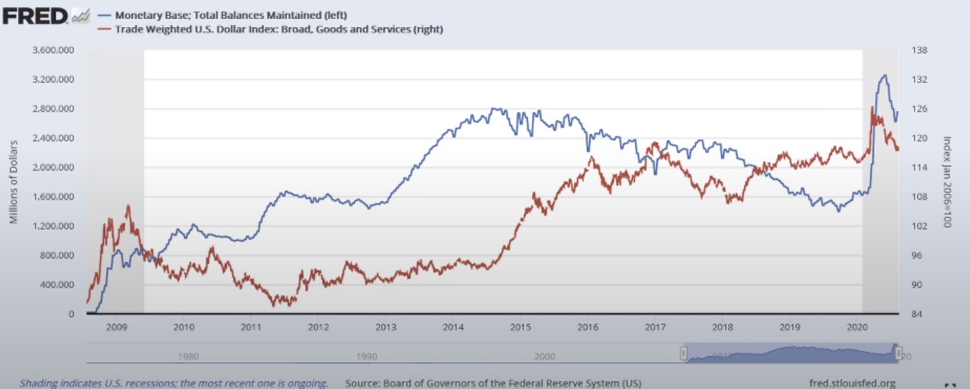 Dette chartet motsier ikke resonnementer ditt vel og merke, ettersom det ikke sier noe om den relative pengetrykkingen vs andre land. Men det viser en tydelig positiv korrelasjon mellom “monetary base” og USD.