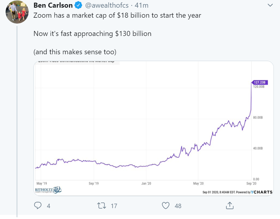 Det rare er at all tech tror de skal til Mars. En ting er at f.eks. Zoom har steget siden januar (naturlig nok), men det er jo de siste ukene det har gått helt bananas.