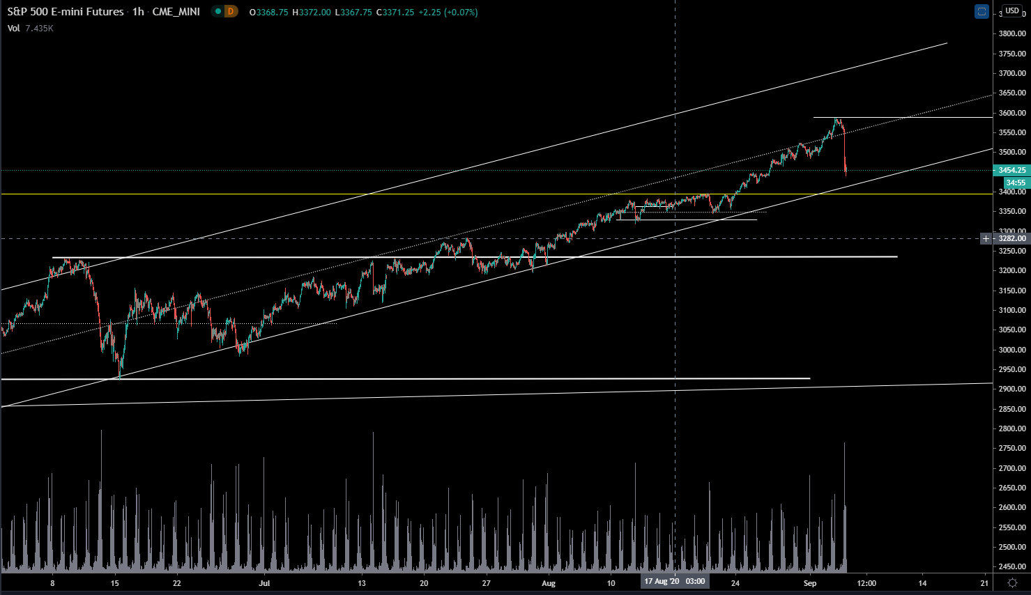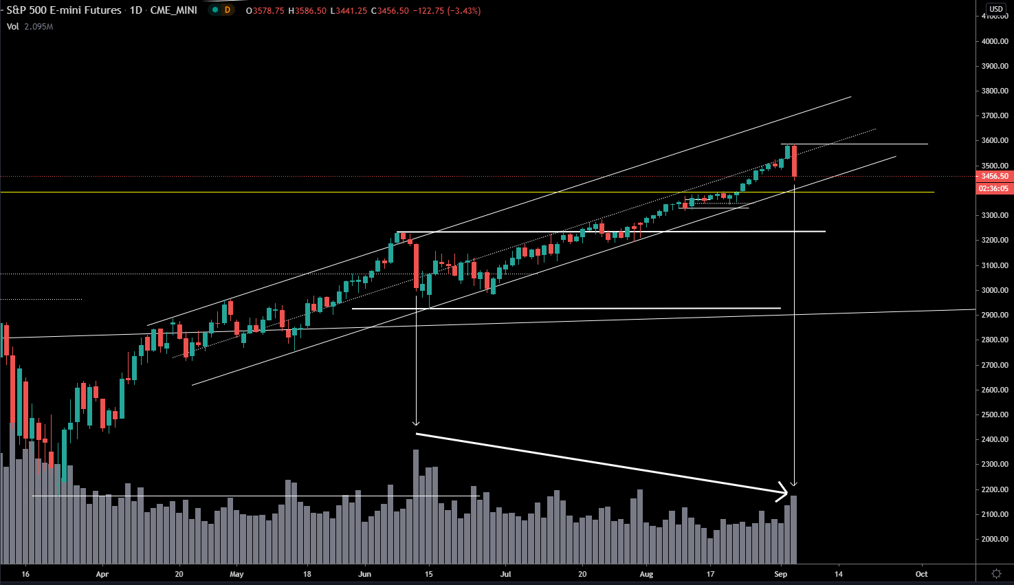 Nå får jeg ikke opp volumprofil på S&P så kan ikke si om dette var volumklimaks, men ut fra futures så ser dette litt antiklimaktisk ut. Vet ikke om det gir noe mening her og nå, men jeg tror denne korreksjonen desverre utsetter det store krakket (altså lik det vi så i Mars) med noen måneder. Mitt bet er at vi faller, henter oss inn igjen, og lager ny ATH før den store smellen kommer