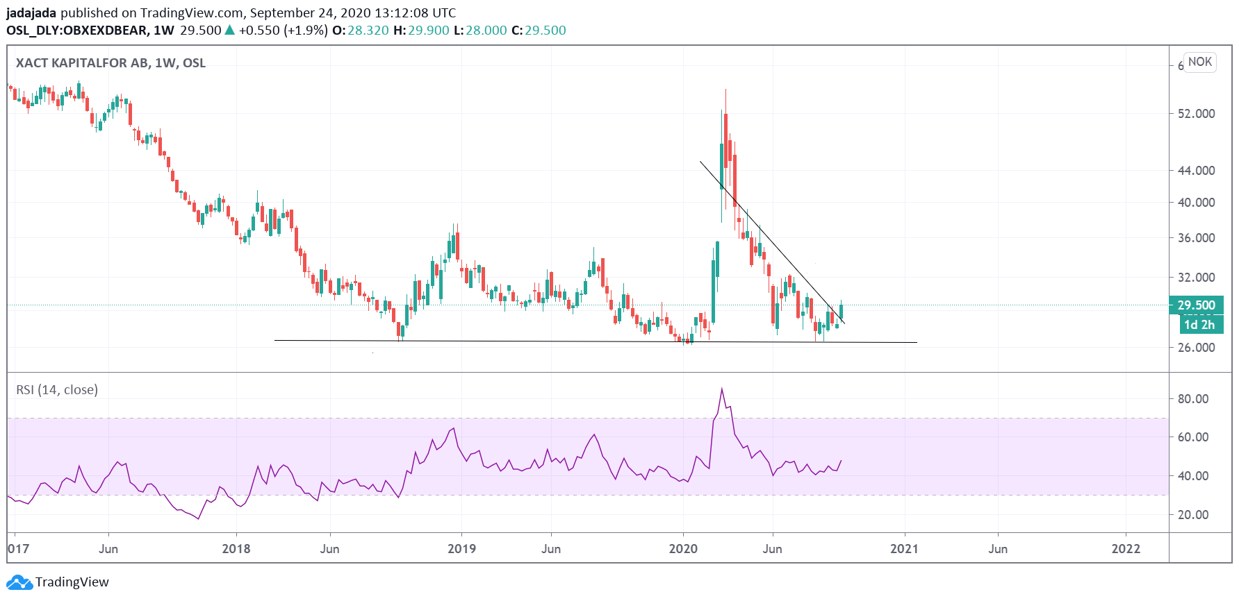Sp500 - ser det ligger an til en falling wegde fra toppen og til i dag. Der vi samtidig treffer weekly 21 ema og 20 ma, og korreksjonen er 10% som kan forventes i en opptrend. Er det i morgen vi snur opp eller hva er det eg ikke ser?