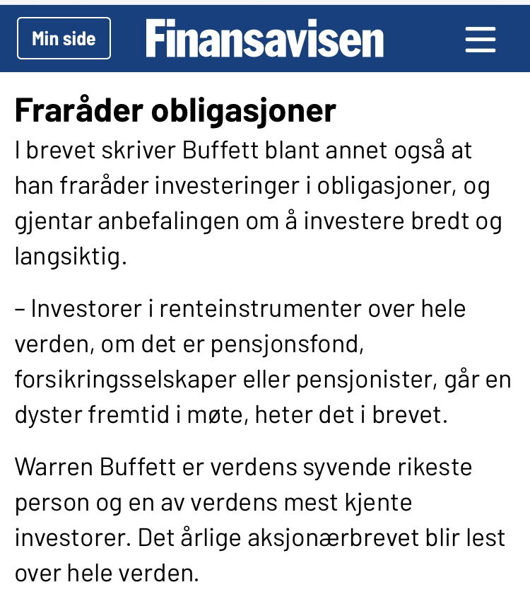 Det kan også bety at han mener inflasjonen vil være høyere enn renten, men at sentralbankene vil holde renten nede. Dvs at det vil være billig å finansiere investeringer og at aksjer relativt sett vil bli billigere.