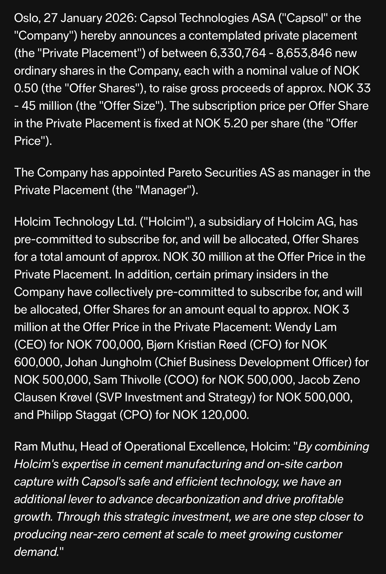 Holcim blir med dette nest største aksjonær i Capsol.