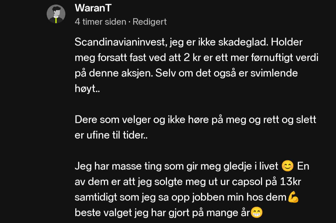 Sur for han ikj fekk 20% bonus. Påsto at aksjen skulle ligge på 1 kr ved nyttår. Svarer alltid negativt viss noken skriv om capsol. Kvifor følge med, el sette seg slik inn i ein aksje, når ein ikj eig noke. Eg har trua på capsol💯