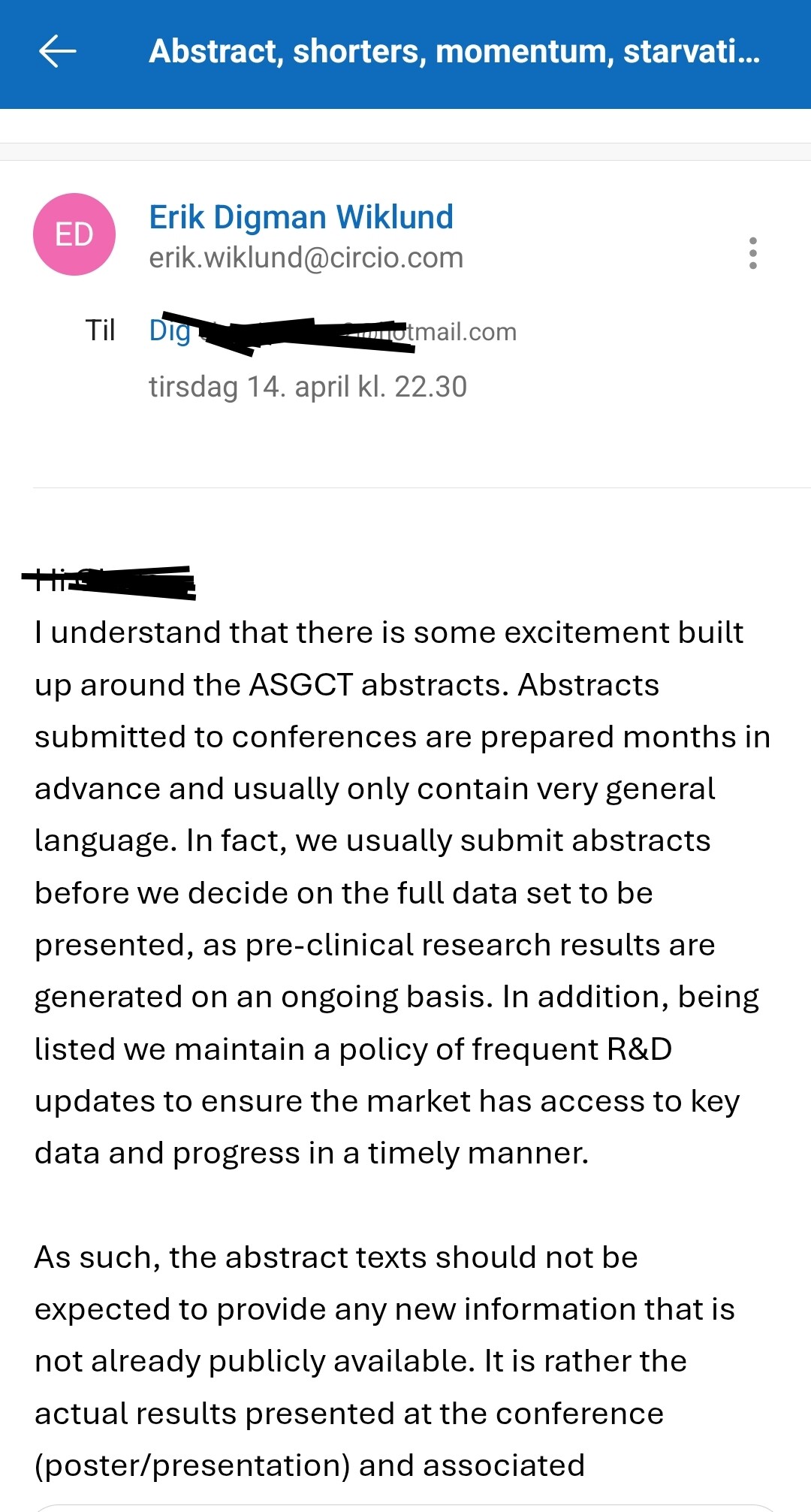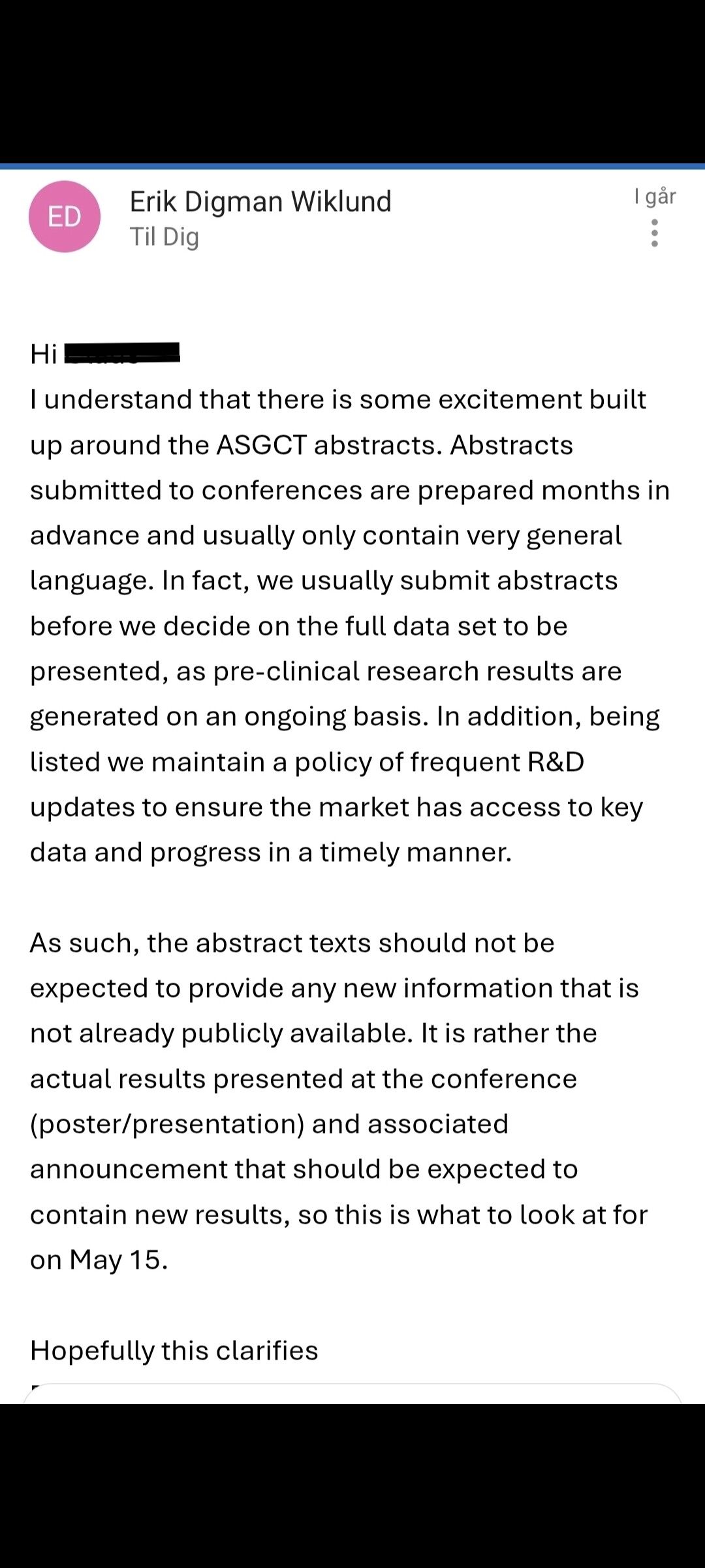 Det som er spennende er hva Circio skal presentere på ASGCT, ellers er det forventning til nyhetsstrømmen og konferansene fremover.