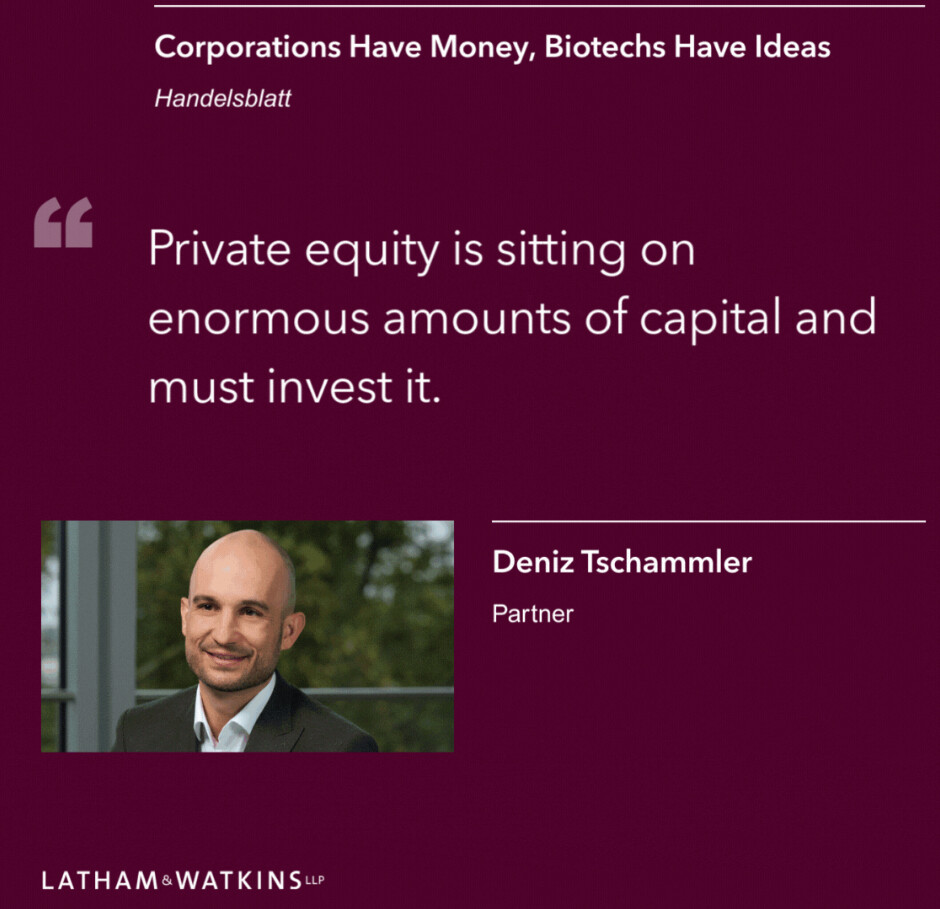 Tilgjengelig kapital : «Private equity sitter på enorme mengder kapital – og må investere den», sier partnerne Deniz Tschammler (Latham & Watkins) og Podpolny (Bains). Mange fond må nå også selge eiendeler for å fordele avkastning – spesielt den som ble generert under pandemien. Selskapene selv har også rikelig med midler; industrien regnes som en av de mest lukrative i verden. Ifølge analytikere i investeringsbanken Stifel har de 18 største farmasøytiske selskapene til sammen et oppkjøpspotensial på 1,2 billioner dollar. Ett problem gjenstår: «Det er ikke alltid klart for farmasøytiske selskaper nøyaktig hvor de skal investere pengene sine», sier Tschammler. Legemiddelindustrien opererer i et volatilt markedsmiljø. Høyt kostnadspress i helsevesenet, reformer i legemiddelsektoren, geopolitiske spenninger og sårbare forsyningskjeder gir investeringsutfordringer.