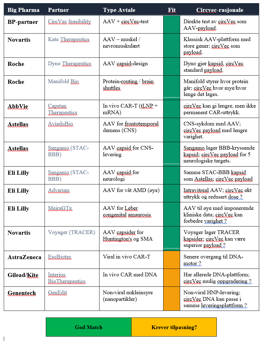 BP er aggressive og søker plattform-teknologier. Da blir det et interessant eksperiment å vurdere hvordan circVec kan passe inn som en komplementær teknologi i disse avtalene, selv om vi ikke har alle forutsetningene for å vite hvor konkurransedyktig cirvec egentlig er (hva finnes rundt omkring, akademia, spinoffs, biotechs).