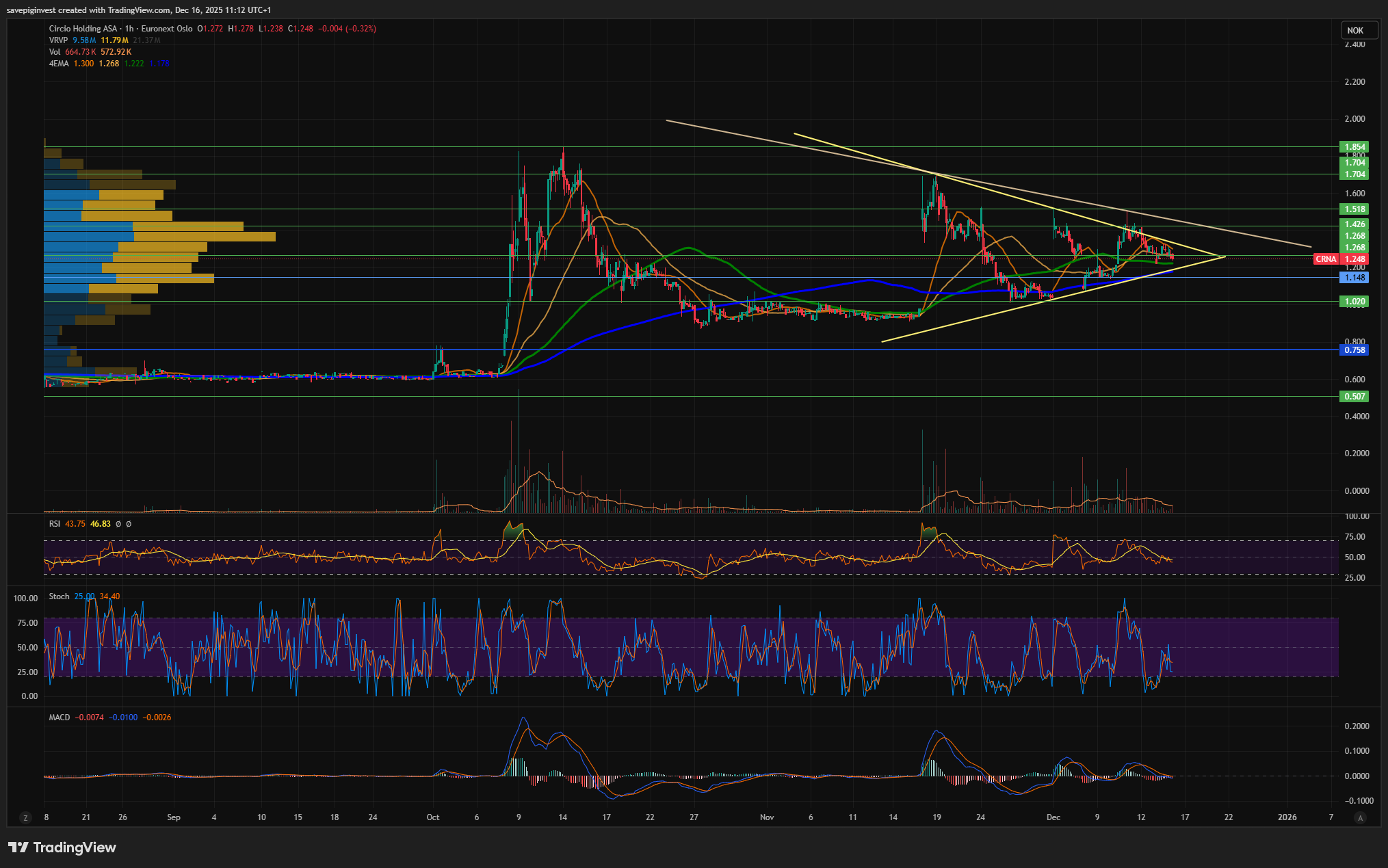 Chartmessig ikke noe nytt, den holder seg jevnt innenfor denne vinkelen fra tidligere. Det som er mest forventet er at den vil gjøre et tydelig utslag enten oppover eller nedover fra en sånn formasjon, ganske snart. Hvis den bryter oppover, så er det higher lows og fin flyt.