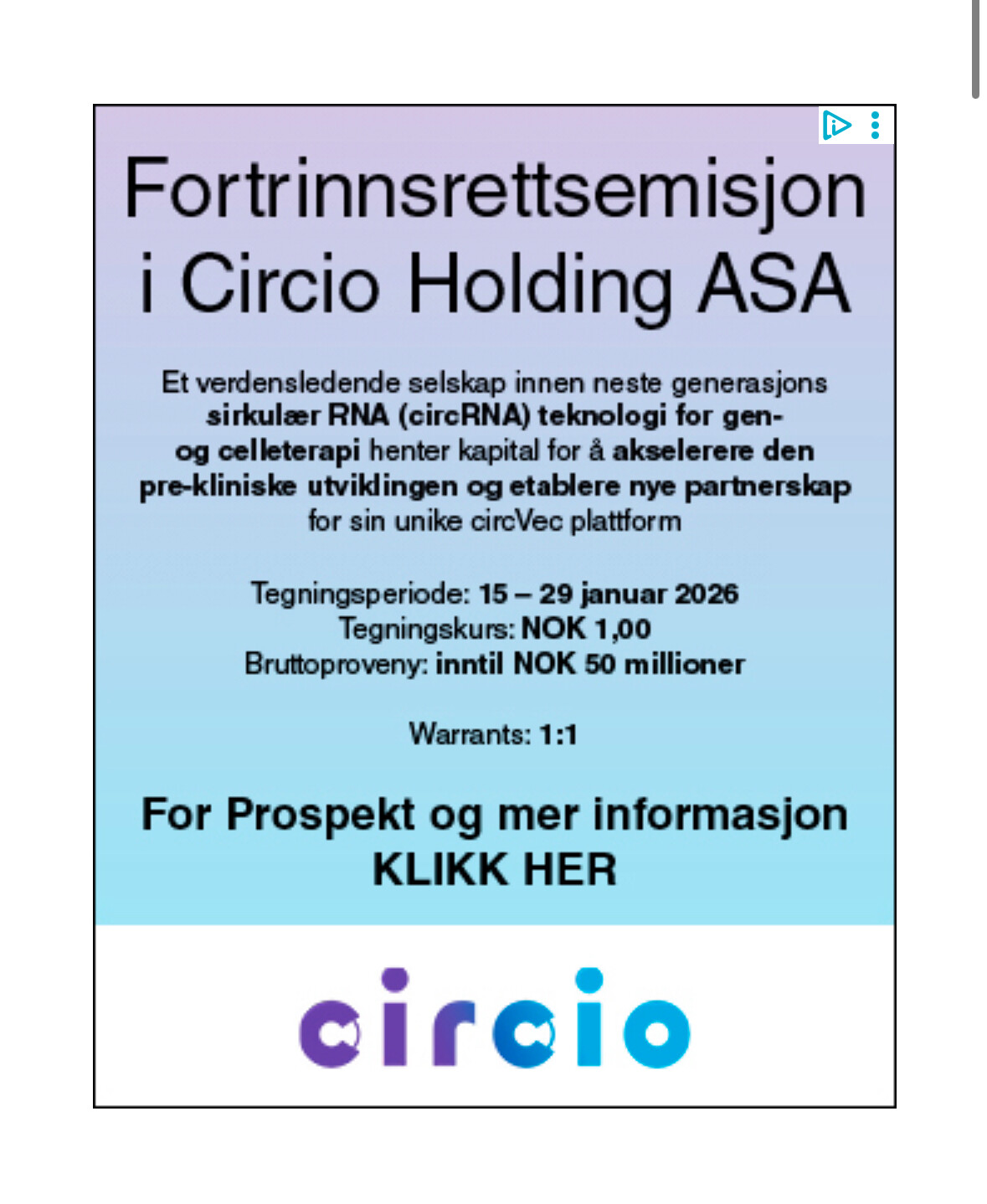 In addition, we estimate a third licensing agreement in the Bull scenario within in vivo CAR therapies. While the in vivo CAR field remains preclinical across the industry, with no human efficacy data to date, we assume that positive early validation of circVec’s differentiated expression profile could enable Circio to enter a platform-level collaboration or licensing agreement. Given the early-stage nature of the field and circVec’s dependence on delivery technologies outside Circio’s control, this opportunity is modelled conservatively through a risk-adjusted upfront payment of approx. NOK 100m, with no explicit modelling of downstream milestones or product sales. This approach captures upside optionality while maintaining valuation discipline.