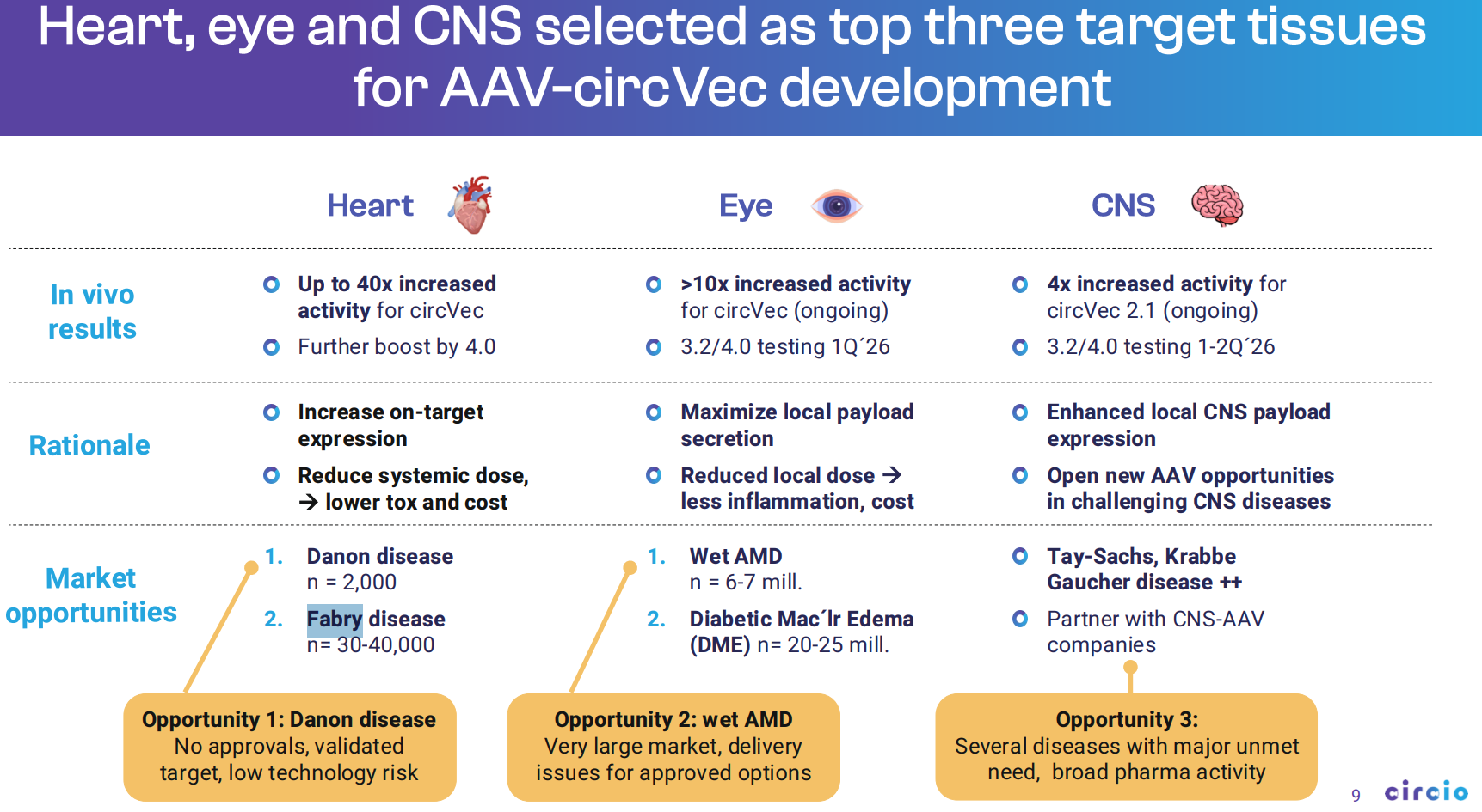 Fabry er nevnt spesifikt av Circio innen hjerteområdet som er selskapets eget interne fokus for AAV-circvec.