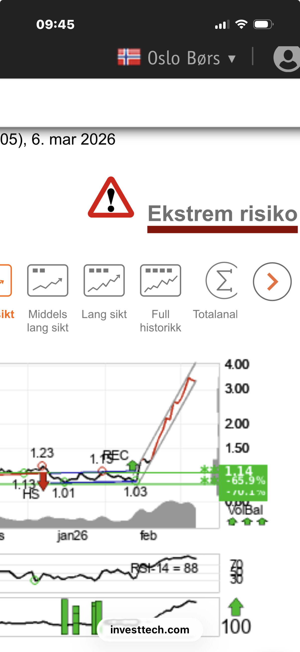 “Circio Holding ASA har brutt opp gjennom taket på den stigende trendkanalen på mellomlang sikt, noe som åpner for enda sterkere stigningstakt. Det er ingen motstand i kursdiagrammet og en videre oppgang indikeres. Ved reaksjoner tilbake har aksjen støtte ved cirka 1.58 kroner. Positiv volumbalanse indikerer at kjøperne er aggressive mens selgerne er passive, og styrker aksjen. RSI over 70 viser at momentumet i aksjen er sterkt positivt på kort sikt. Investorer har stadig gått opp i pris for å få kjøpt aksjen, noe som indikerer økende optimisme og at kursen skal fortsette opp”