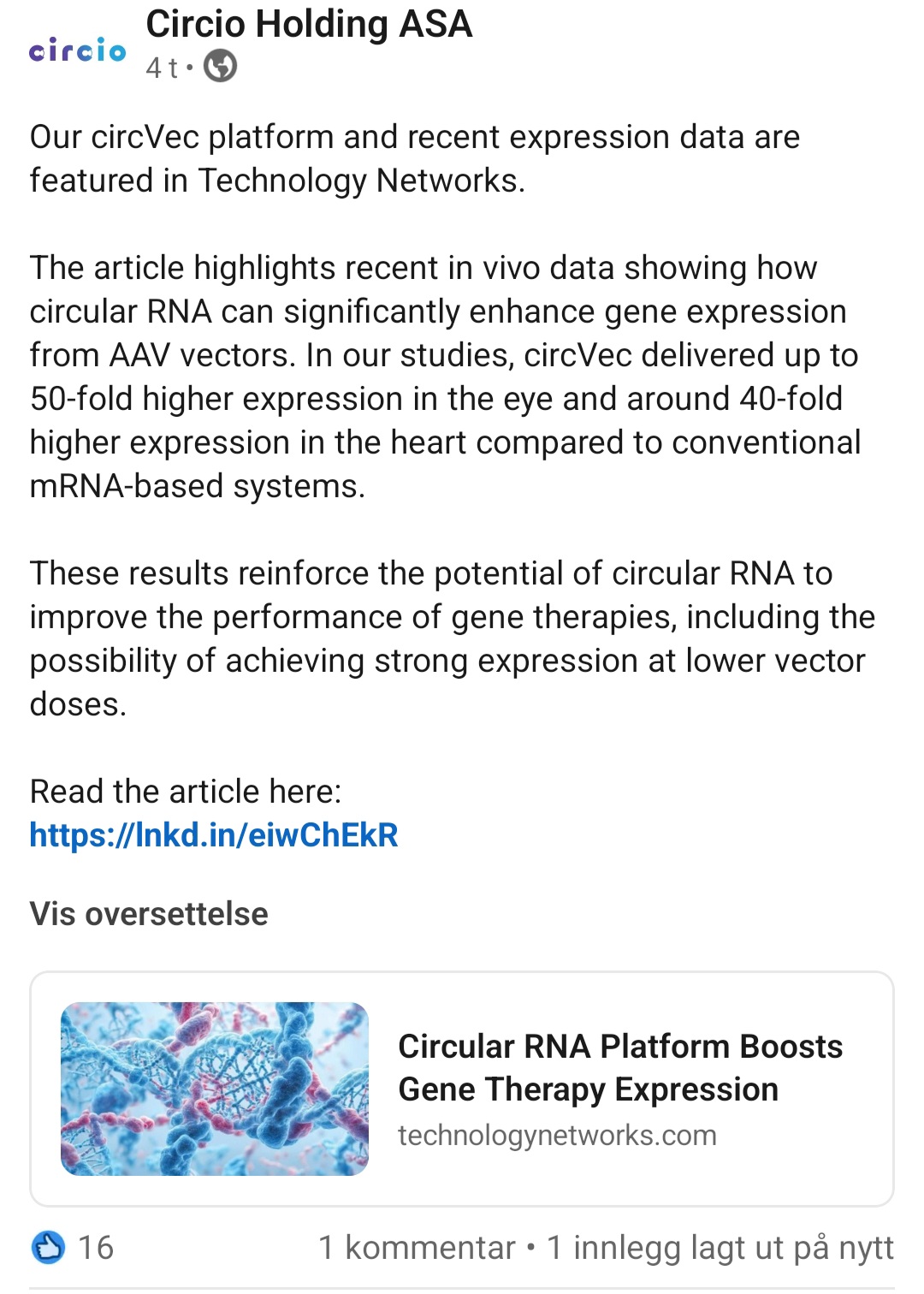 Siste ord er ikke sagt når det gjelder hvilke sykdommer dette vil fungere på, men fordi biologien er såpass konservert på dette nivået ville det være overraskende hvis ikke circVec-DNA genererer circRNA i humane celler.