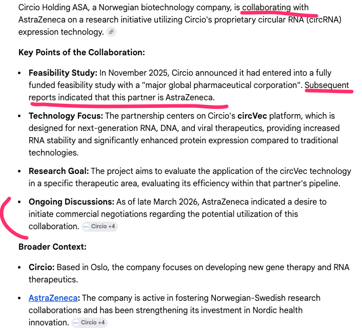 Så hvis man tenker 18 måneder fra februar 2026, havner man på august 2027. Når kan man så anta at Eli Lilly kontaktet Orna? De har sikkert kjørt en grundig due diligence og alt som er. Kan man anta 1/2 år tidligere? I så fall kan det forventes at Circio blir kontaktet primo 2027…Men jeg vil tro mye før det, etter min mening fremstår Circio sin plattform både bedre og bredere enn Orna sin. Så hvor lenge våger andre BP å vente?!