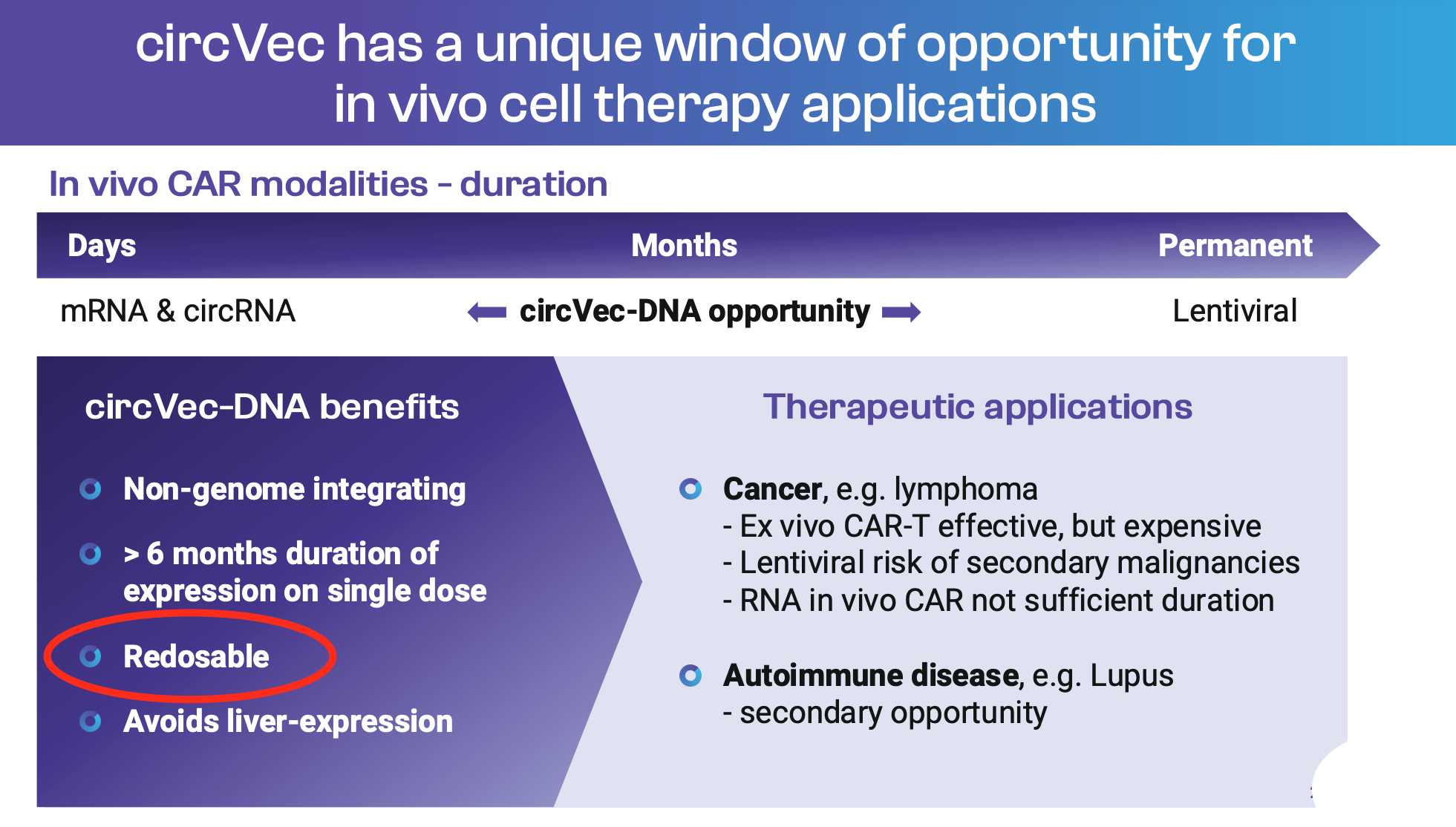 “LNP-delivered circVec offers a unique therapeutic window in the in vivo cell therapy space. Whereas synthetic mRNA and circRNA approaches only allow for transient expression lasting between 2-10 days, DNA-format circVec expression can achieve up to six months durability in immune cells in vivo on a single dose.”
