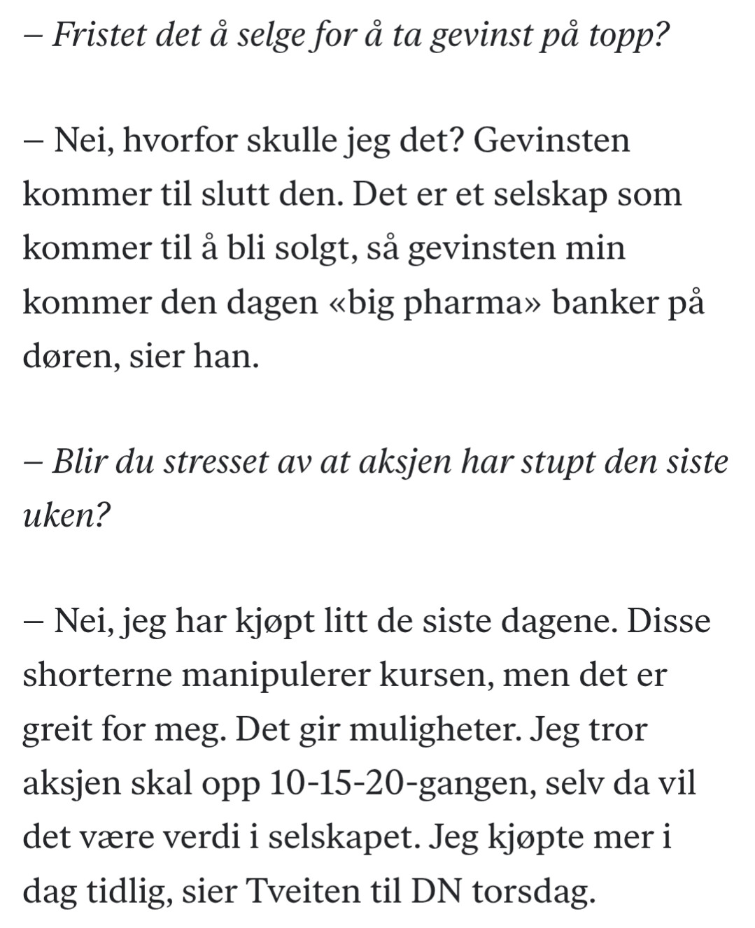 Han er opptatt av dette med 700% og 1000% osv, og at aksjen svinger tosfiret per dag.
