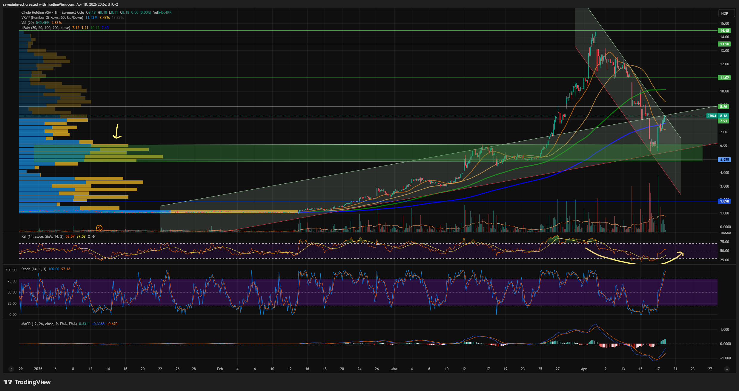 Investtech på kort sikt så er motstandslinjen tegnet på 14,3 men det var ekstrem handle rundt 12-13 før den falt videre ned og etter hvert satte inn rakett fall under emi kurs på 10,8