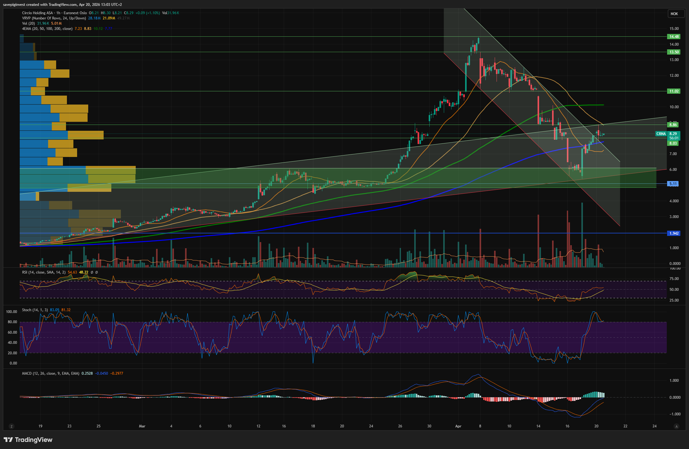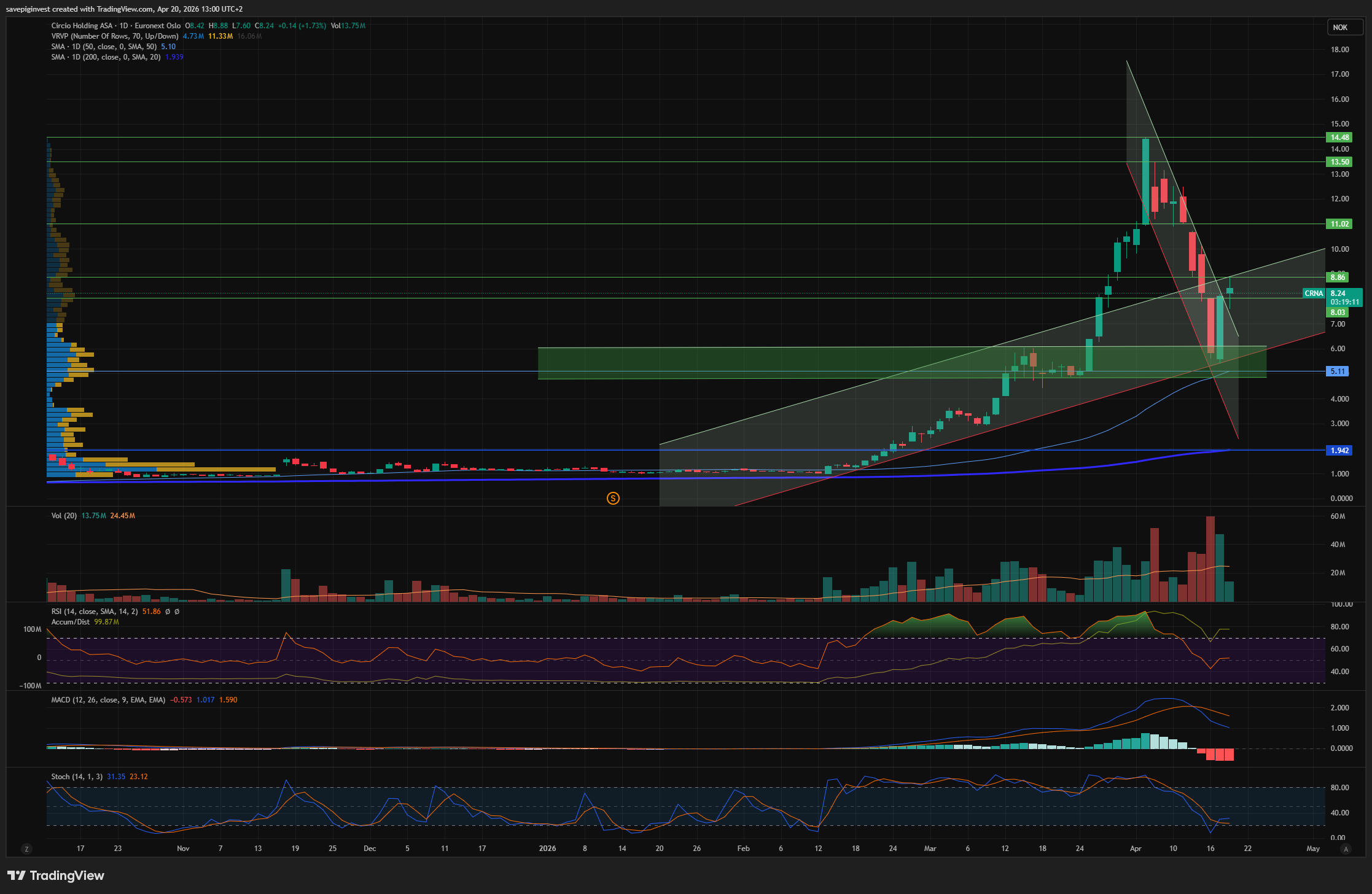 Personlig tror jeg kursen godt kan gå opp herfra, men som alltid er det vanskelig å skille reell etterspørsel fra kortsiktig trading. Det føles ofte som markedet først prøver å riste ut folk (jeg har blitt fillerista flere ganger), før en eventuell oppgang setter fart og FOMO slår inn når de som har solgt må kjøpe seg inn igjen.