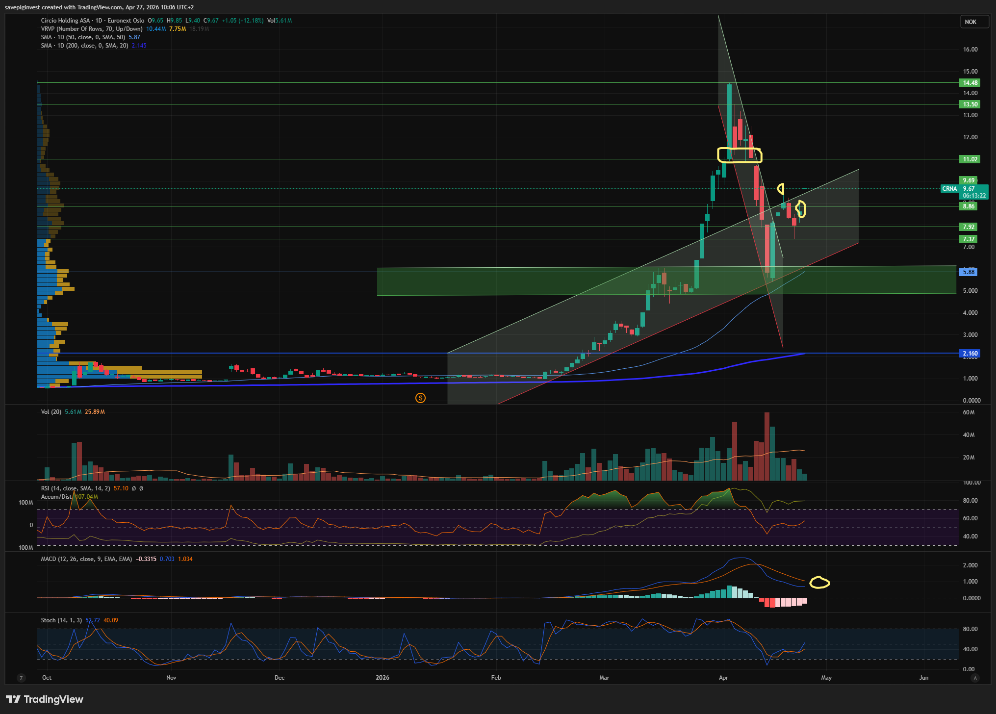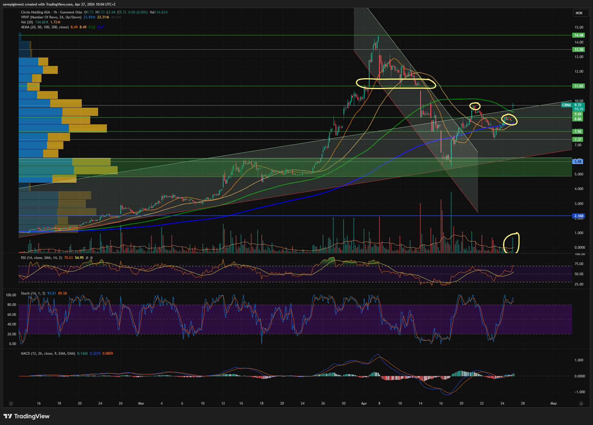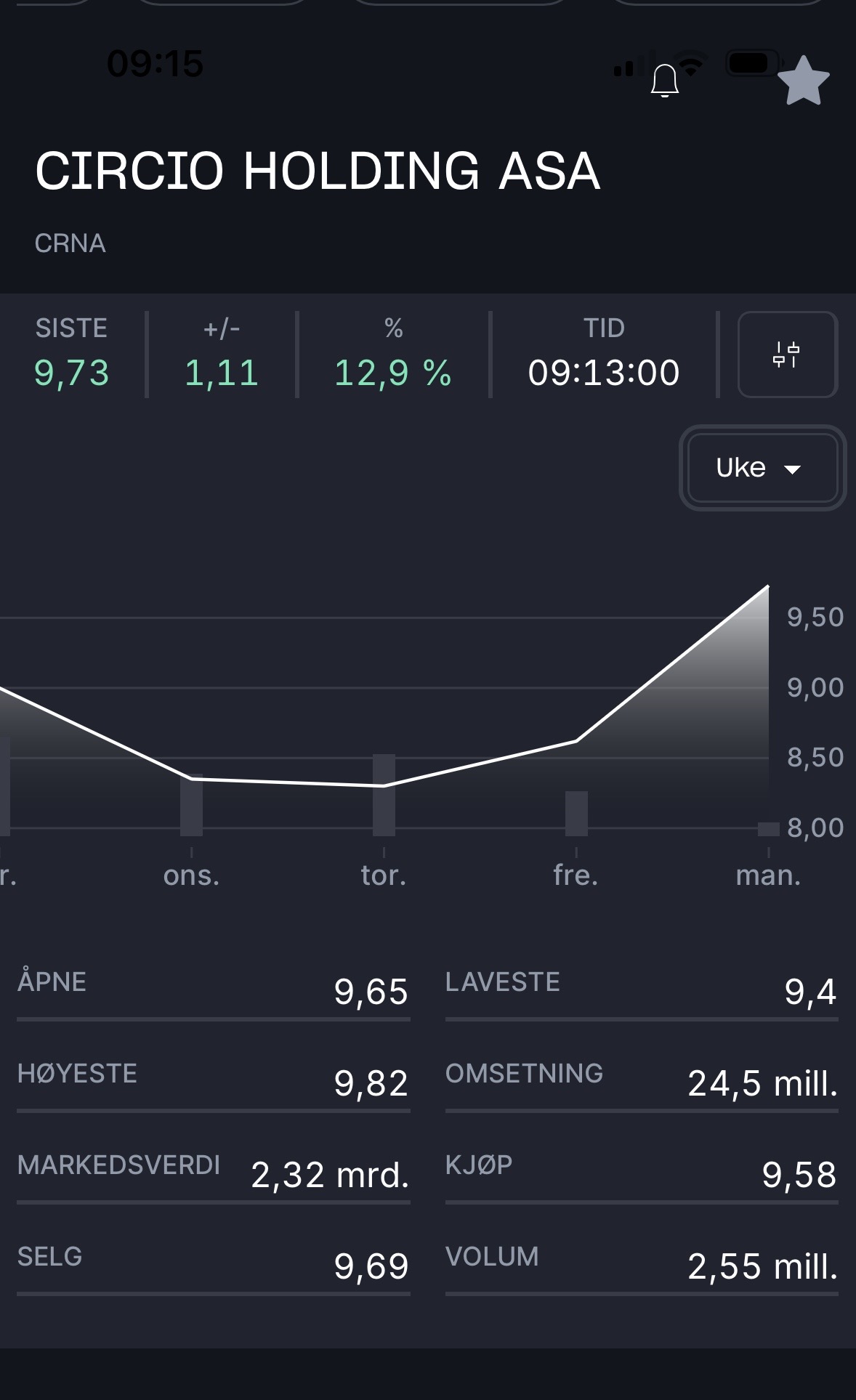 Første time på blokka, banker seg opp gjennom 9 og trader veldig eksemplarisk med å ta en pause på neste nivå opp som er på ca 9,6- Hvis det også ryker så er det emisjonskurs territorie neste, 10,8-11