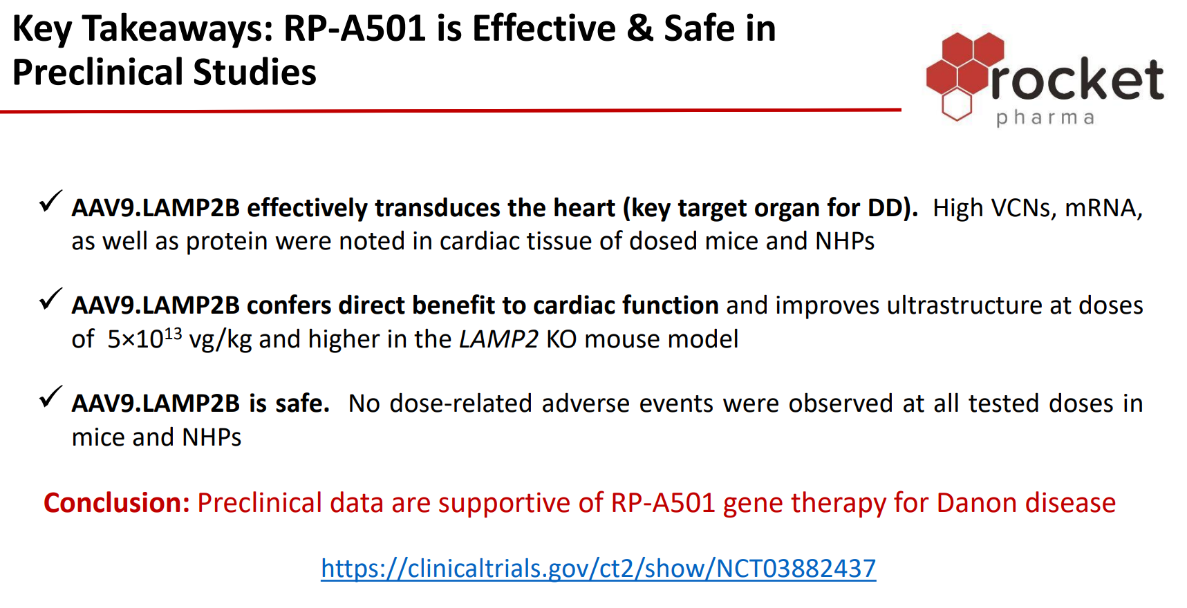 In November 2018, we announced our AAV-based RP-A501 program for the treatment of Danon disease, along with animal study data providing preclinical proof-of-concept for the RP-A501 program. Preclinical efficacy studies were performed in LAMP-2 knockout mice. Four doses of vector were tested for optimal transduction of the heart, skeletal muscle, and liver. Toxicology studies were conducted in wild-type mice and non-human primates. The results from these studies are summarized as follows: