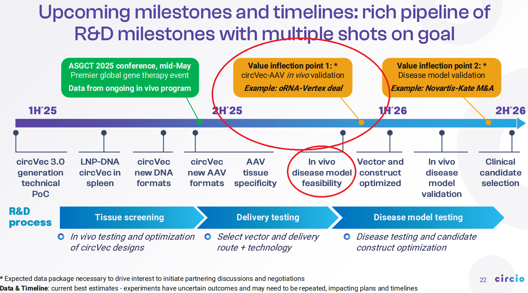 BP sier til Circio: “Vi liker tallene dere har presentert (40× uttrykk, 75× halveringstid), og vi er villige til å dekke alle kostnader for at dere tester dette i vår biologi, med våre capsider, i vår indikasjon. Men vi gir dere ikke lisenspenger, opsjoner eller eksklusivitet før vi har sett at circvec funker i vårt system, at circvec er kompatibel med vår AAV-teknologi, og kan utnyttes til klinisk og kommersielt volum.”